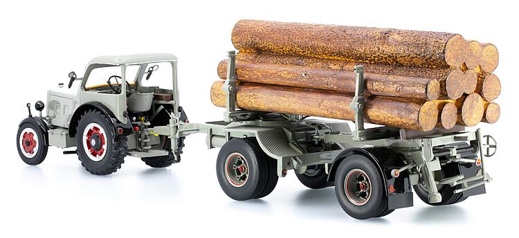 Fertigmodell aus Resin eines Schweizer Traktors, der von 1947 bis 1956 gebaut wurde. Hier im Set mit einem Anhänger.