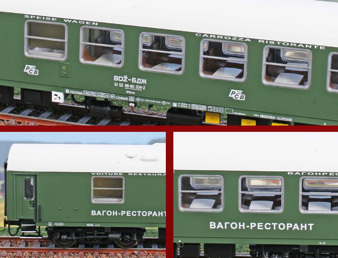 Speisewagen WRme der Bulgarischen Eisenbahn, in grüner Lackierung.
