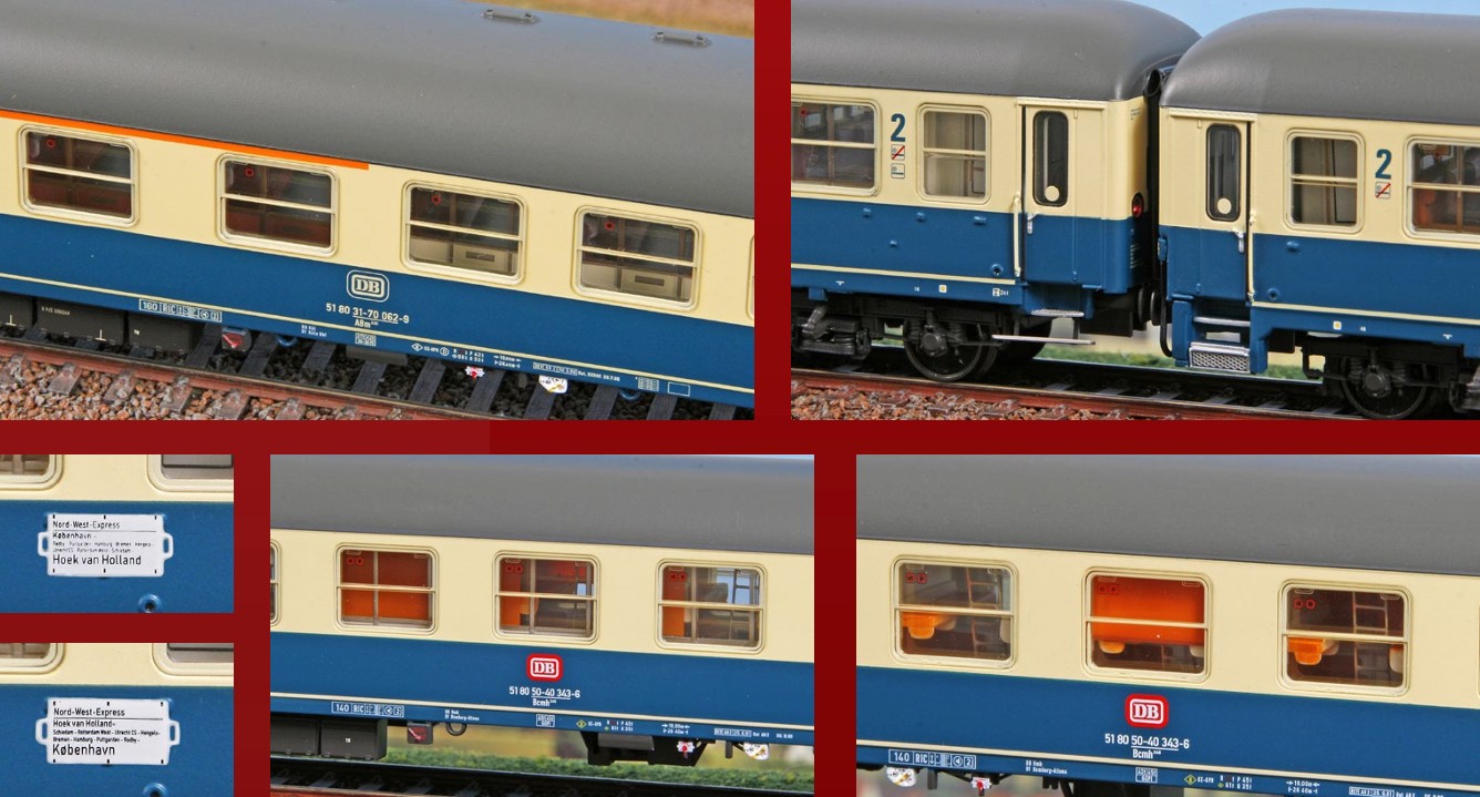 Set Nord West Express 236/237 „Hoek van Holland – København – Helsingør“, bestehend aus einem Liegewagen Bcmh246 DB, einem Wagen 2. Klasse Bm234 DB und einem Wagen 1/2 Klasse ABm225 DB.