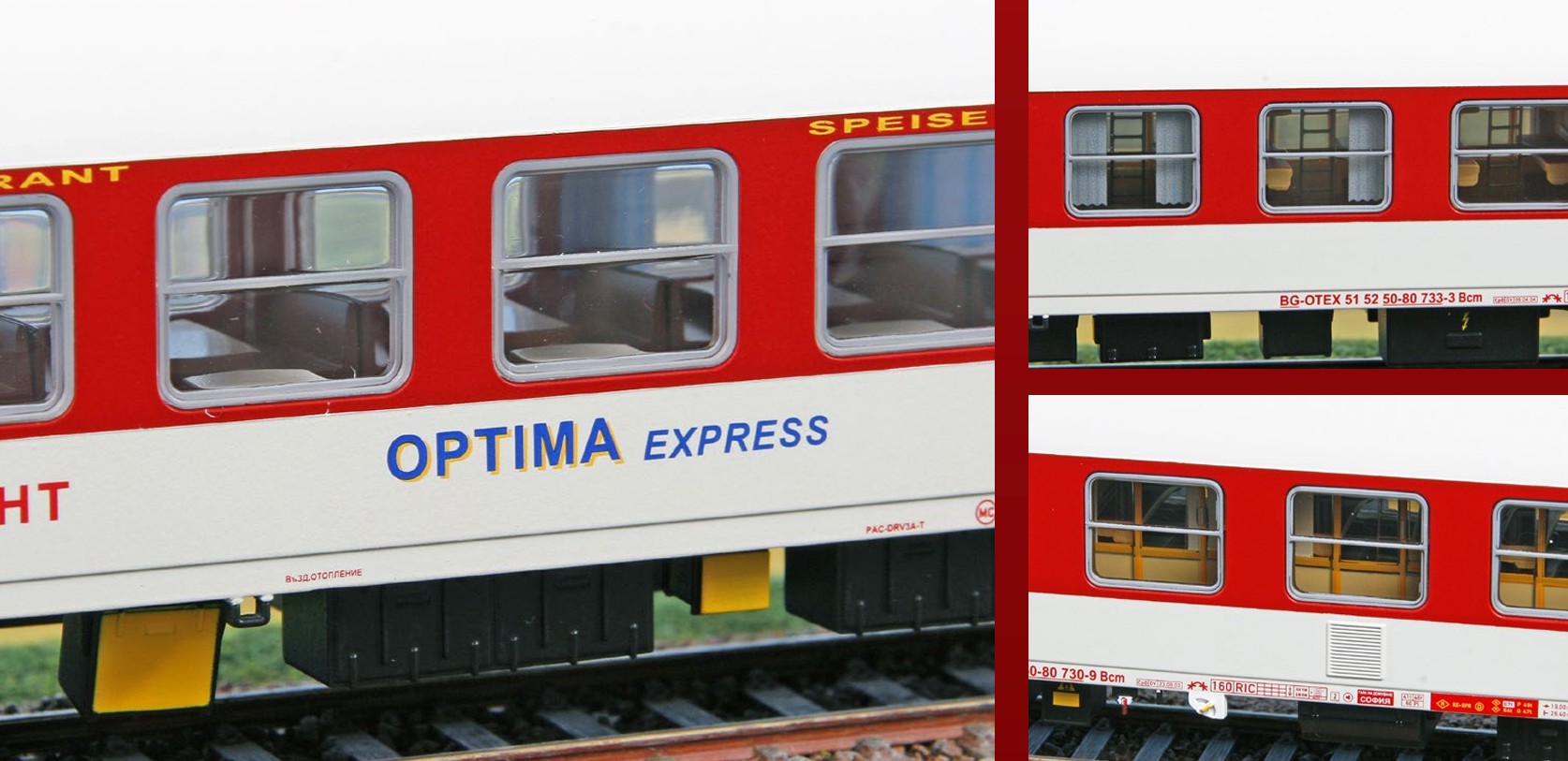 „Optima Express“-Set bestehend aus einem WRme Speisewagen und zwei Bcm-Liegewagen in weiß/roter Farbgebung.