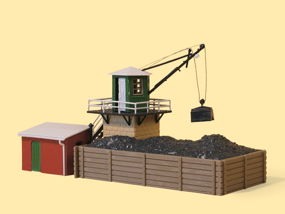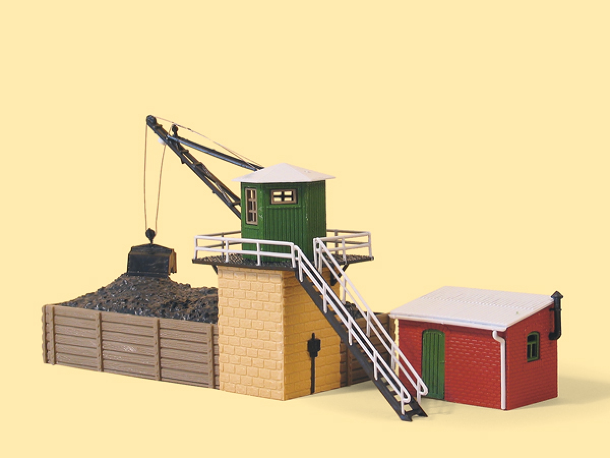 Originalgetreue Bekohlungsanlage aus Dresden-Pieschen. Mit manuell schwenkbarem Kran und Kohlebansen. Ein Antriebsbausatz für unser Modell ist bei der Firma Maschinenbau Leibelt aus Annaberg-Buchholz erhältlich.