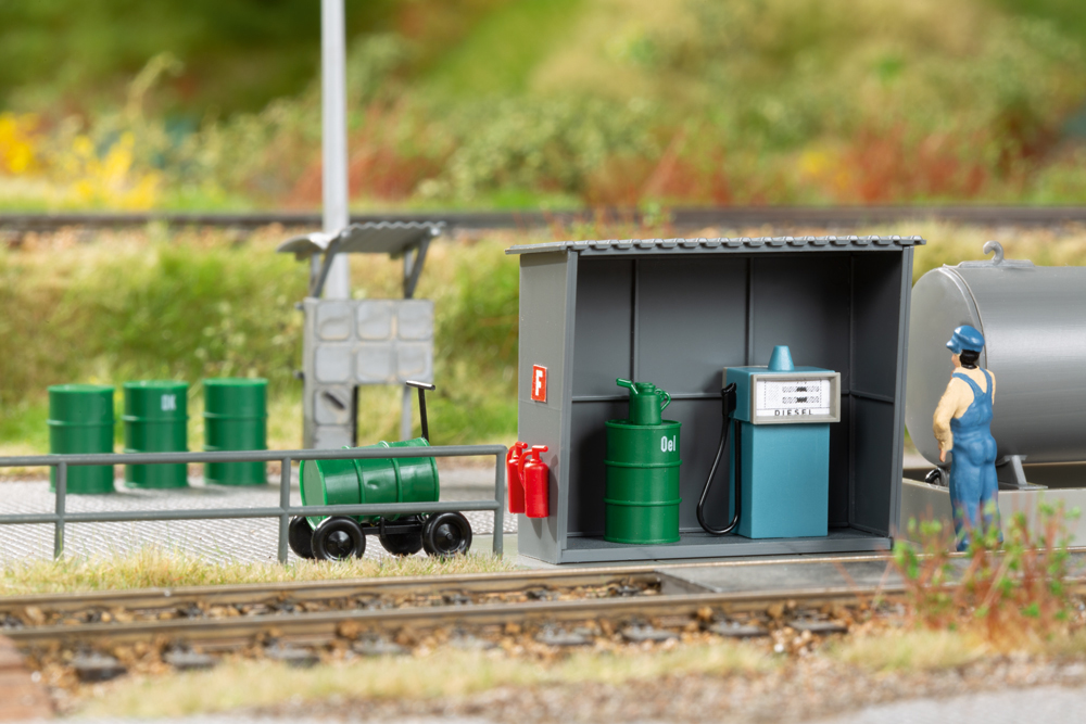 Der ab den 1930er Jahren beginnende Einsatz von Kleindiesellokomotiven im Rangierdienst auf Bahnhöfen oder auch in Industriebetrieben erforderte die entsprechenden Behandlungsanlagen. Das authentische Modell einer in den 60er Jahren modernisierten Tankanlage mit Kraftstoffkessel, wettergeschützter Tanksäule, Ölvorratswagen und Schmierstofflager lässt sich ideal mit unserem Artikel 11 429 Kö-Schuppen kombinieren.