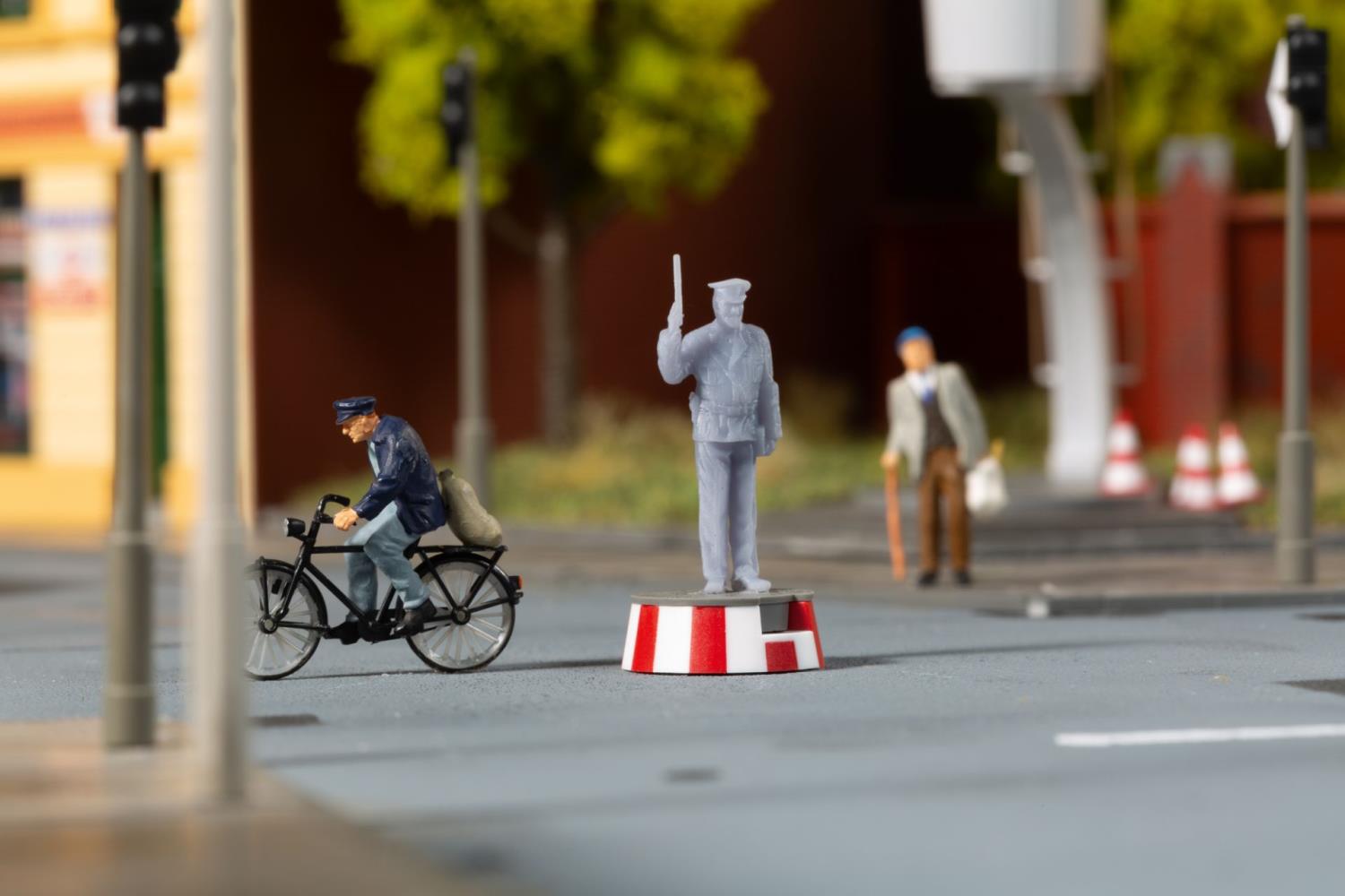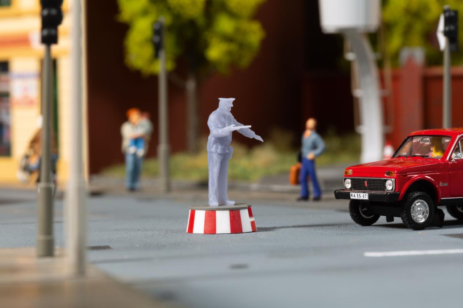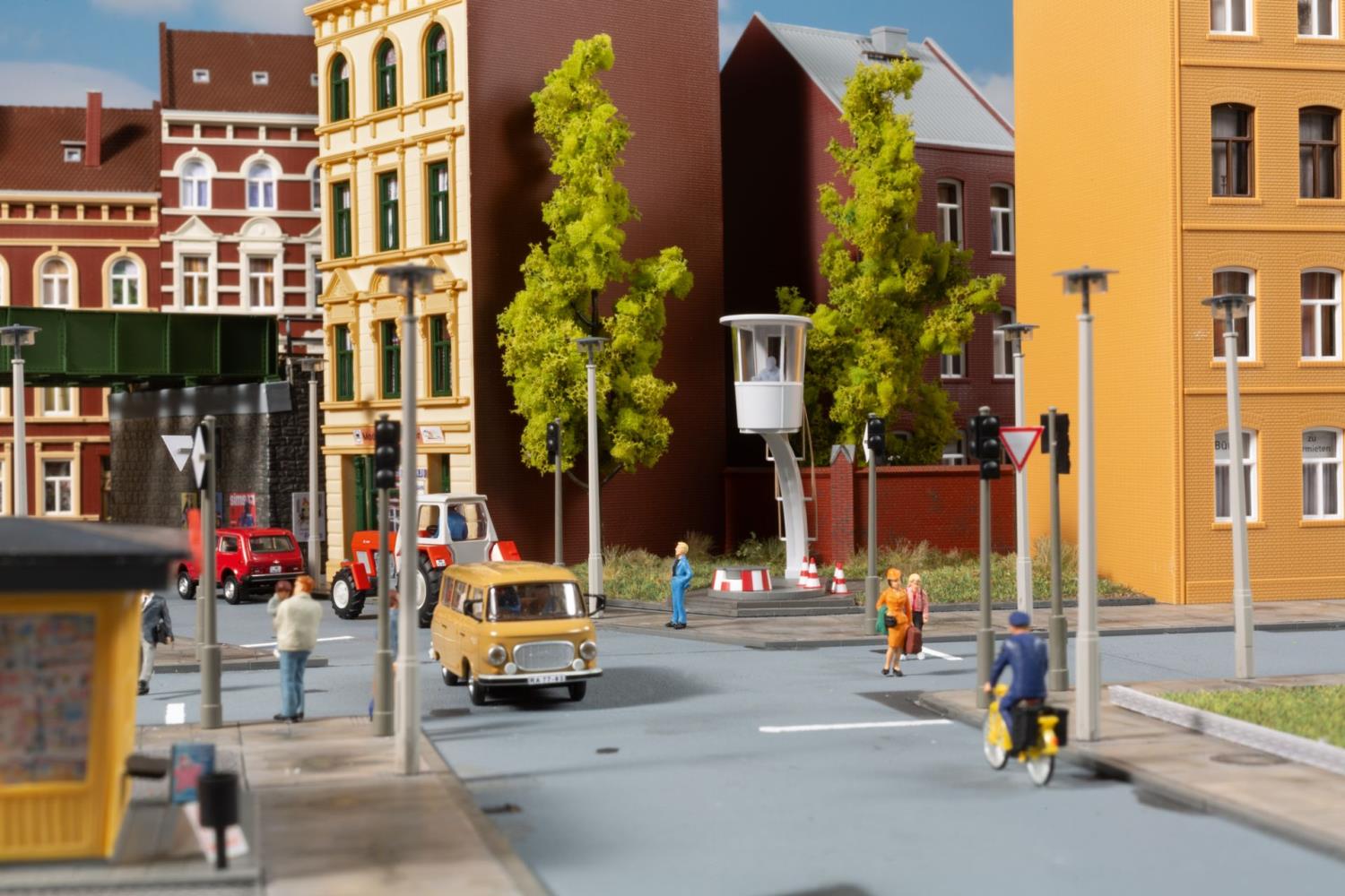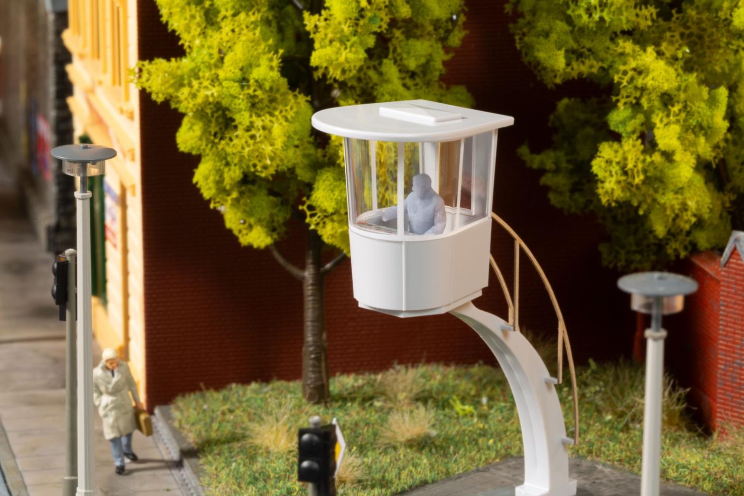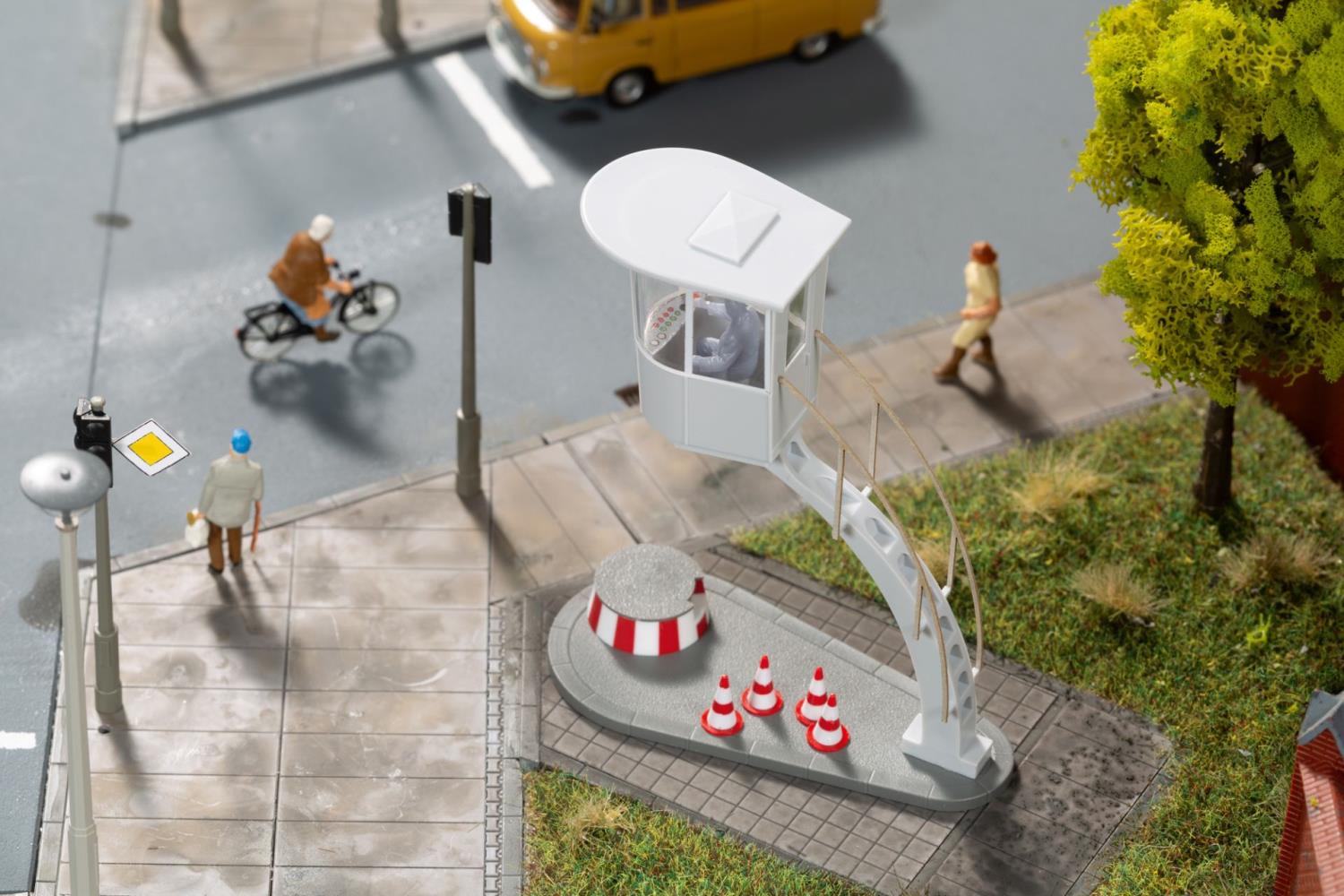 Die stark zunehmende Massenmotorisierung in den 1960er Jahren erforderte an neuralgischen Verkehrsknotenpunkten in Großstädten eine sichere Verkehrsüberwachung und -regelung. Zur Beobachtung und Steuerung des Verkehrs dienten solche Türme. Vom Vorbild unseres Modells konnte bedarfsgerecht manuell in die Steuerung der Lichtsignalanlagen des Straßenbahn-, des Oberleitungsbus- sowie des PKW-Verkehrs eingegriffen werden. Bei einem Ausfall der Technik erfolgte die Verkehrsregelung konventionell durch einen Verkehrspolizisten auf einem Podest in Kreuzungsmitte. Beide Szenarien können mit passenden, beiliegenden unbemalten Figuren nachgestellt werden. Originalmodell