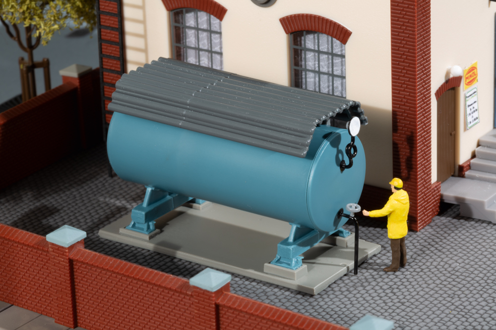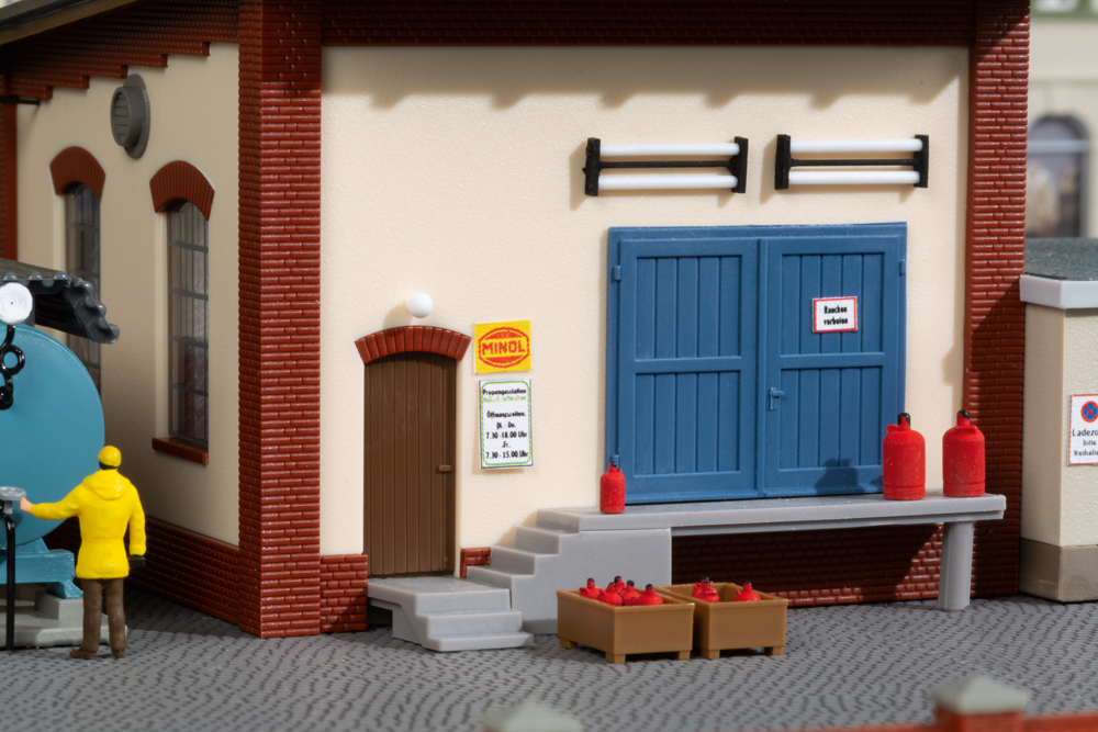 Die kleine ländliche Abfüllstation für Flaschengas sichert in ihrem Einzugsgebiet den Bedarf an Propangas für private Abnehmer zum Kochen, Heizen und zur Warmwasserbereitung. Aber auch kleinere mittelständische Betriebe werden von hier aus versorgt. Das Modell, bestehend aus Haupt und Nebengebäude nebst Gaskessel wird ergänzt durch beiliegende Gasflaschen unterschiedlicher Größe, Transportkisten sowie einer umfangreichen Dekoration.