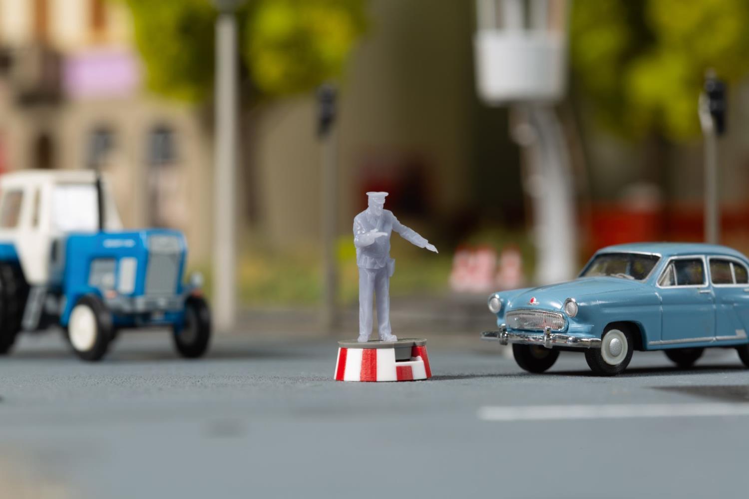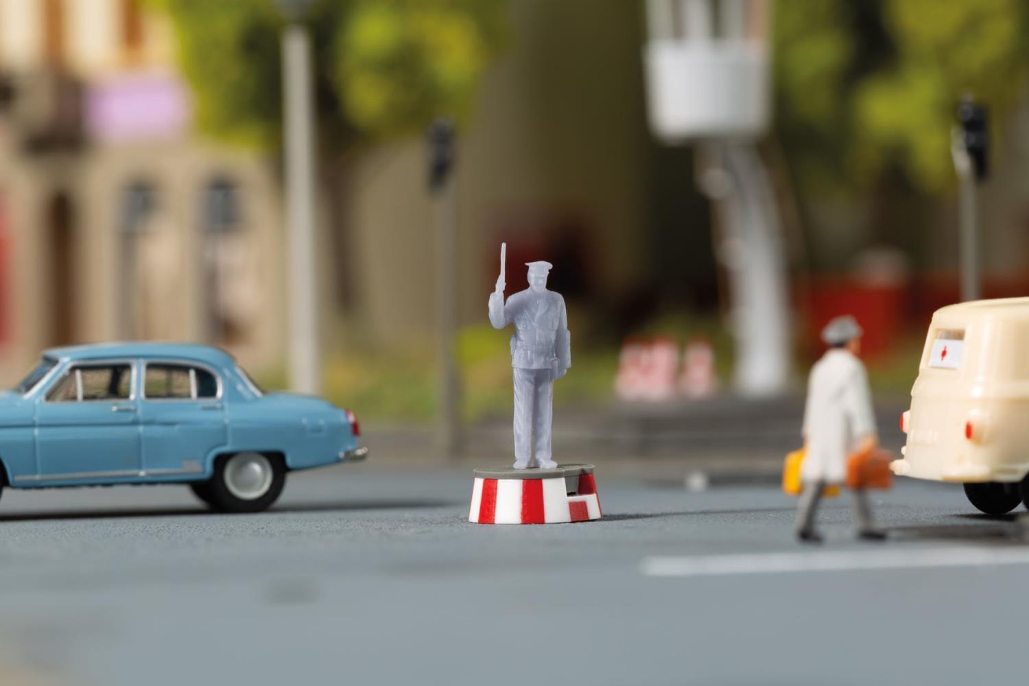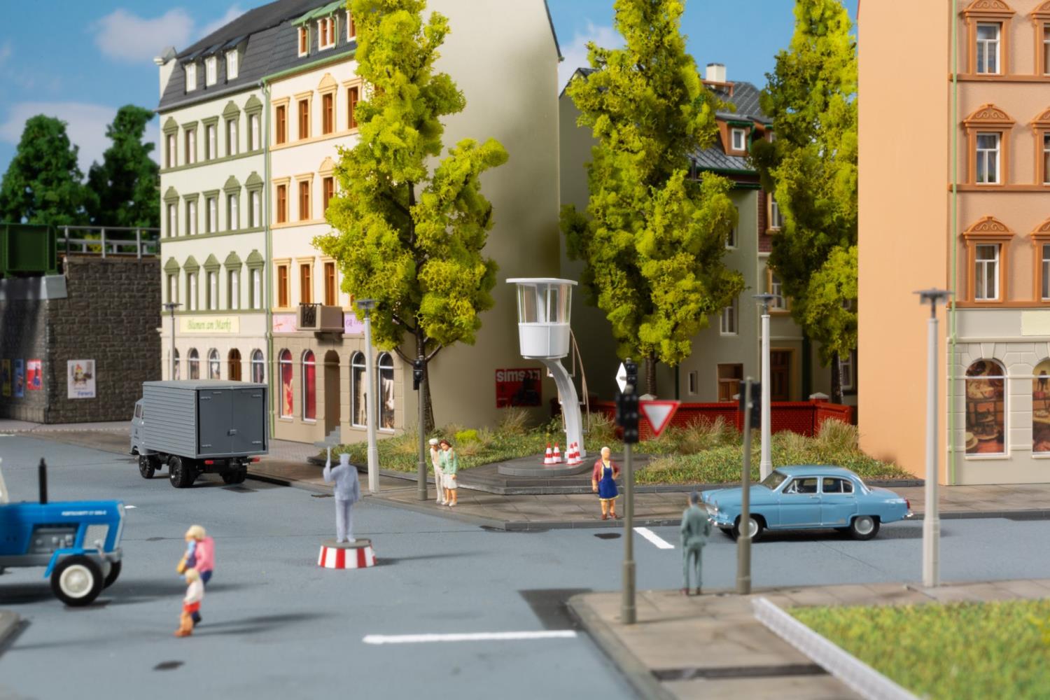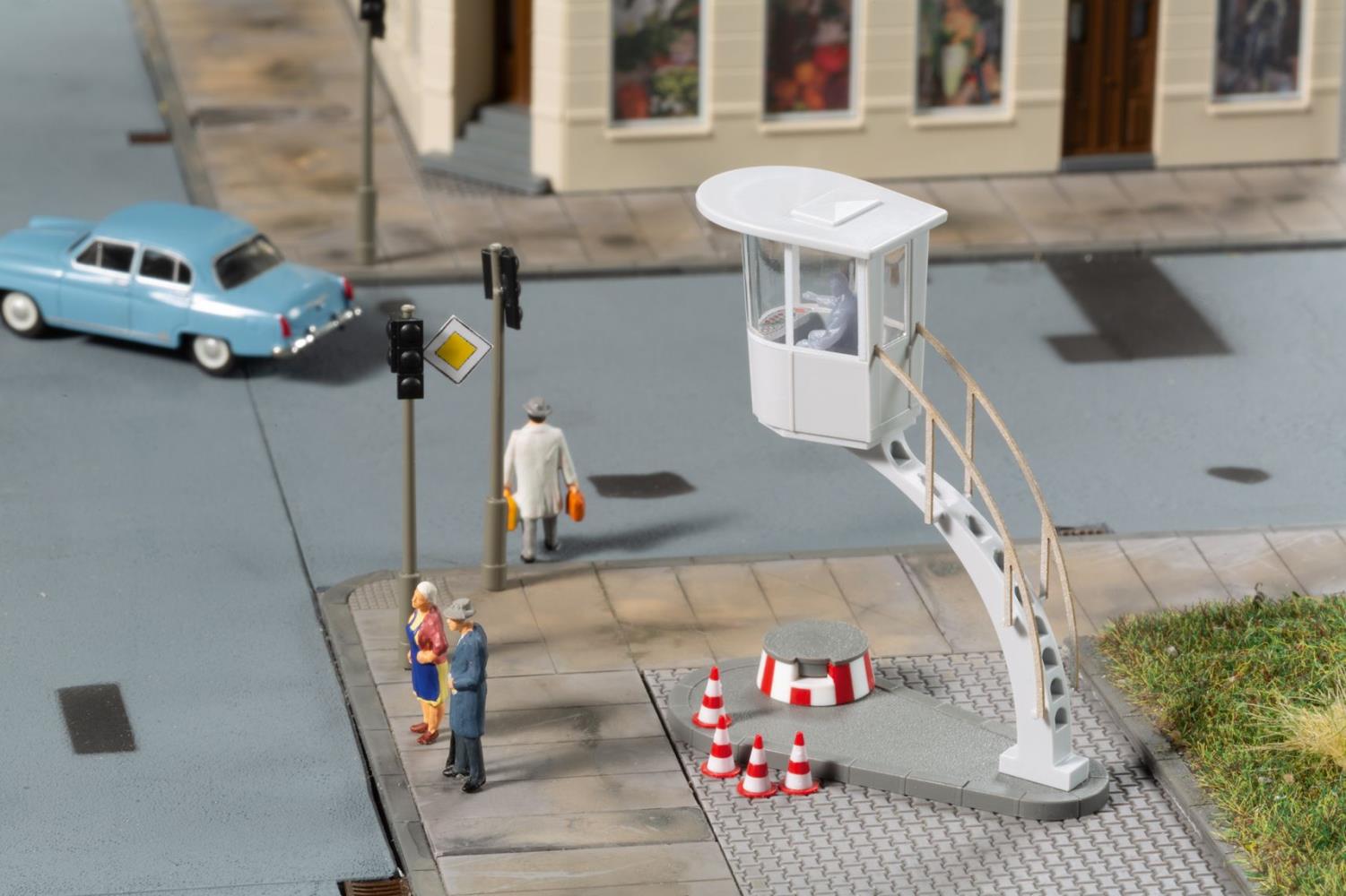 Die stark zunehmende Massenmotorisierung in den 1960er Jahren erforderte an neuralgischen Verkehrsknotenpunkten in Großstädten eine sichere Verkehrsüberwachung und -regelung. Zur Beobachtung und Steuerung des Verkehrs dienten solche Türme. Vom Vorbild unseres Modells konnte bedarfsgerecht manuell in die Steuerung der Lichtsignalanlagen des Straßenbahn-, des Oberleitungsbus- sowie des PKW-Verkehrs eingegriffen werden. Bei einem Ausfall der Technik erfolgte die Verkehrsregelung konventionell durch einen Verkehrspolizisten auf einem Podest in Kreuzungsmitte. Beide Szenarien können mit passenden, beiliegenden unbemalten Figuren nachgestellt werden. Originalmodell