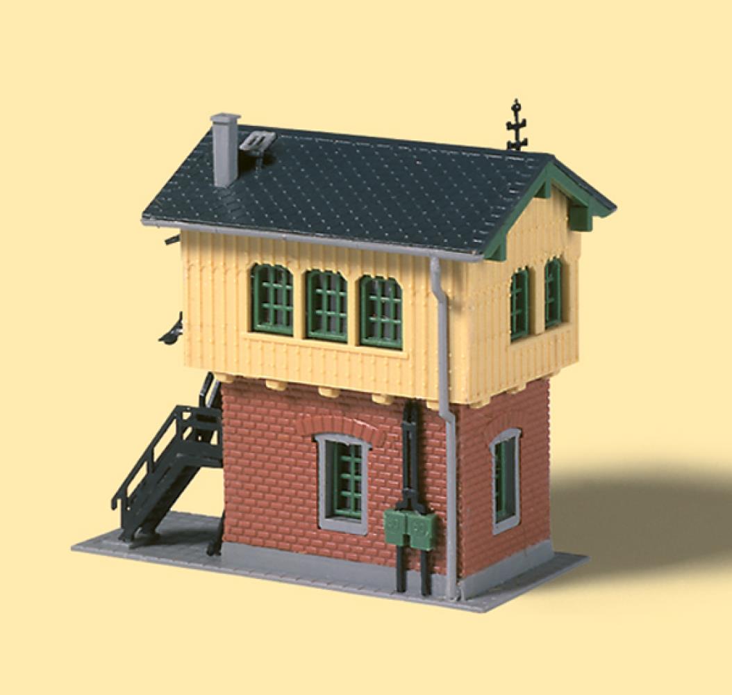 Die Holzverkleidung im Obergeschoss und die Klinker geben dem ca. 1900 erbauten Stellwerk ein romantisches Aussehen. Die eiserne Außentreppe sowie Scheinwerfer und Hebelbank im Innenraum machen das Modell sehr interessant.