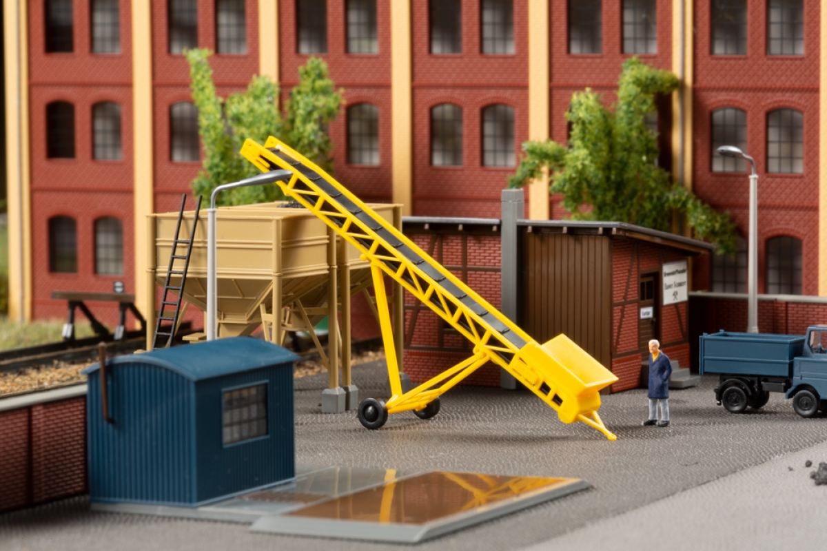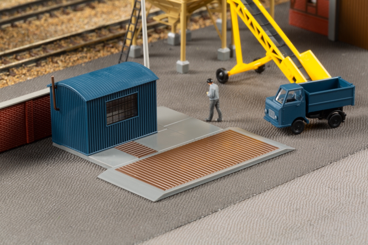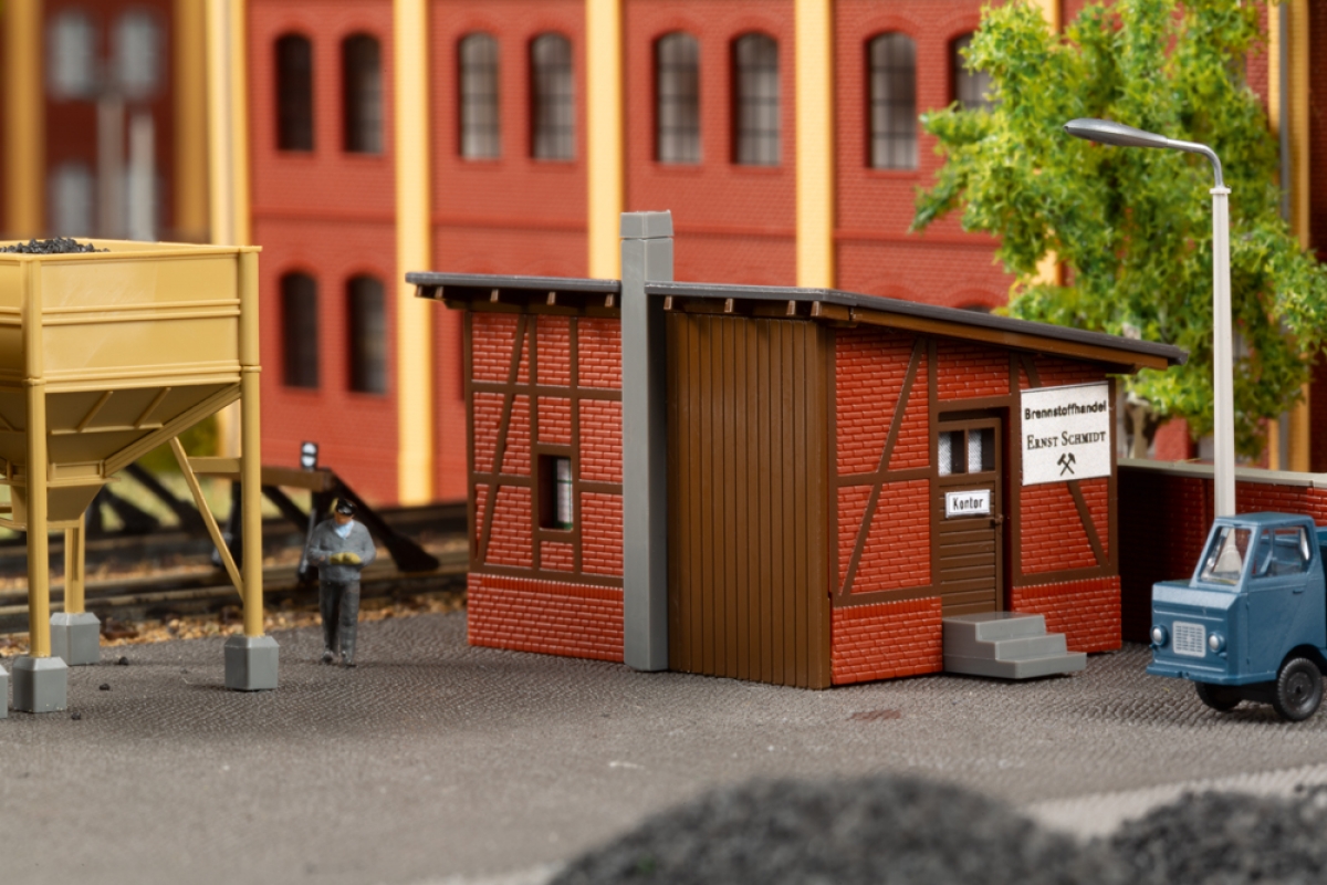 Brennstoffhandlungen gehörten früher fast überall zum Ortsbild. In unserem - eher kleinen - Modell gibt es Brennstoffe jeglicher Art. Der Bausatz enthält ein Bürogebäude und zwei Kohletrichter mit einer Leiter aus Lasercut-Karton. Zur Beschickung der Trichter und der Beladung der Fahrzeuge dient ein Förderband. Vor und nach dem Beladen werden die Fahrzeuge auf der LKW-Waage gewogen. Die Wiegeeinrichtung steht wettergeschützt in einem Wellblechhäuschen.