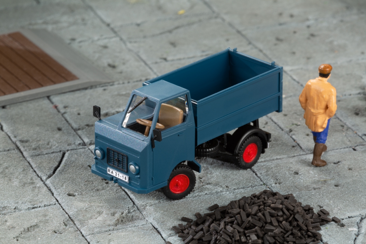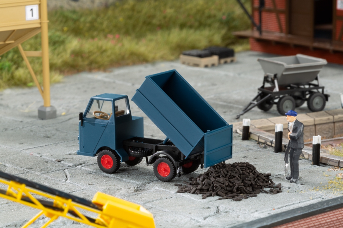 Bausatz. Die Multicar M22-Fahrzeugserie wird um eine weitere Variante ergänzt. Passend zu unserem Thema Brennstoffhandel erscheint das Modell als Hochbordkipper in blaugrauer Farbgebung. Der Aufbau ist angekippt darstellbar, mit geöffneter Rückwand. Der dazu passende Kipplorenanhänger entspricht einem Vorbild der Firma Fahrzeugbau Lampe aus Möser bei Burg. Die Mulde ist kippbar, die Vorderachse lenkbar.