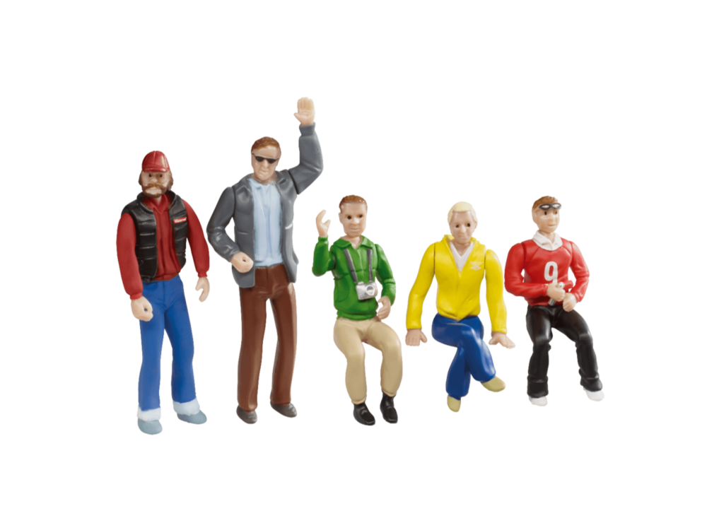 Moderne Dekorationsmöglichkeit für die Rennbahnstrecke! Die Ausarbeitung der colorierten Figuren ist extrem detailgetreu und es gibt verschiedene, positionierbare bzw. drehbare Körperteile! Der kleine Figurensatz besteht aus 5 Figuren: 3 sitzende Figuren 2 stehende Figuren