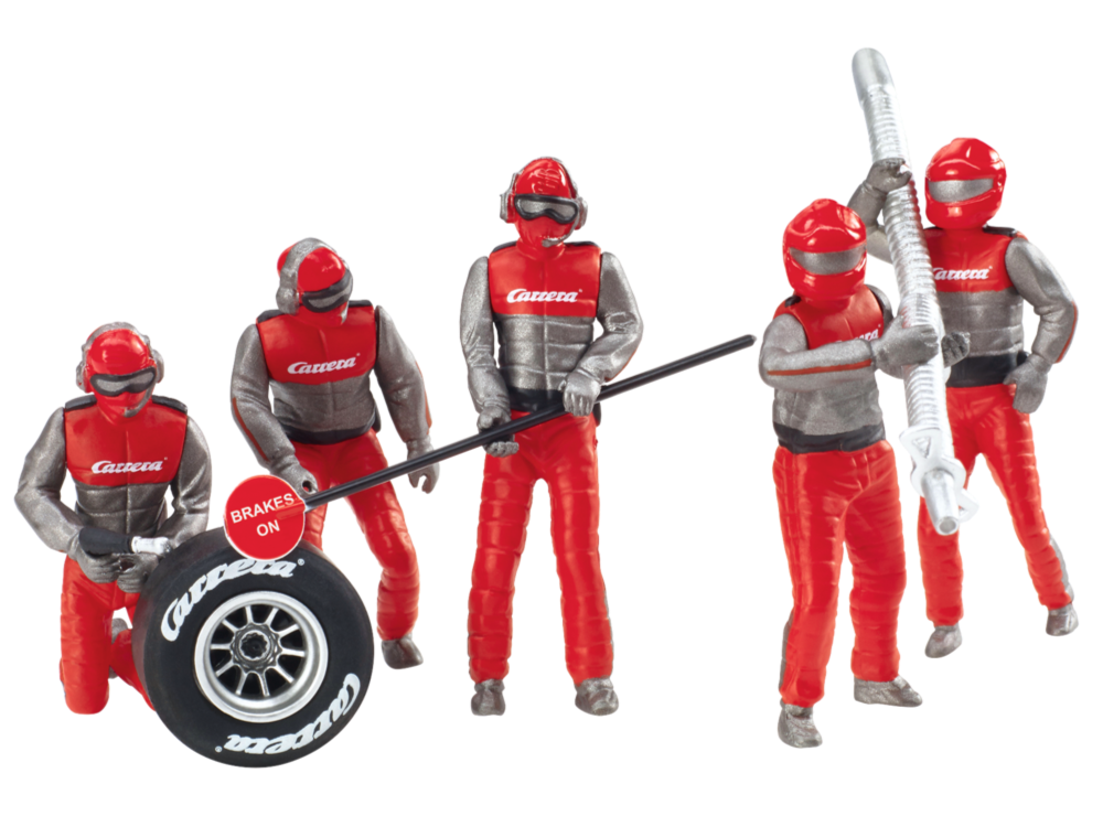 Mechaniker Figurensatz im Carrera DesignDIGITAL 124, DIGITAL 132 und EVOLUTIONGeeignet als De koration für die Rennbahn Ohne sie läuft nichts rund: Die Mechaniker Beim Boxenstopp sorg en die Mechaniker dafür, dass Reifen gewechselt, technische Probleme behoben und Reparaturen am Auto vorgenommen werden. Klar, dass die Mechaniker dann auch auf der Carrera Bahn nicht fehlen dürfen! D ie Carrera Mechaniker-Crew besteht aus fünf Figuren und begeistert im roten Dress. Neben der detailg etreuen Verarbeitung überzeugen die modernen Figuren auch mit ihren verschiedenen, positionierbaren bzw. drehbaren Körperteilen. Die Mechaniker machen eine hervorragende Figur und ergänzen perfekt Dei ne Carrera Bahn. Für eine authentische, liebevoll gestaltete Rennstrecke ist mit dem Mechaniker-Figu rensatz auf jeden Fall gesorgt! Somit findet ein Boxenstopp mit Mechanikern, wie in einem echten Ren nen statt.