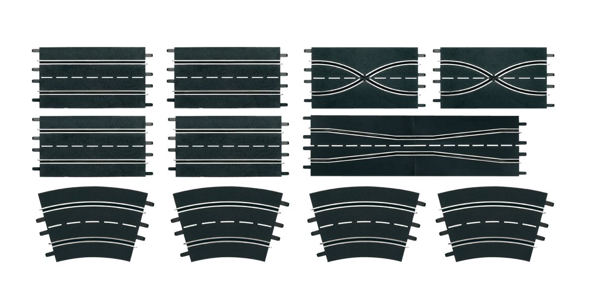 Packungsinhalt: 4 Stück Standardgeraden , 2 Stück Spurwechselstücke, 2 Stück Engstellen, 4 Stück Kurven2 / 30 Grad, Bahnstückverriegelungen