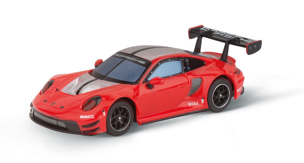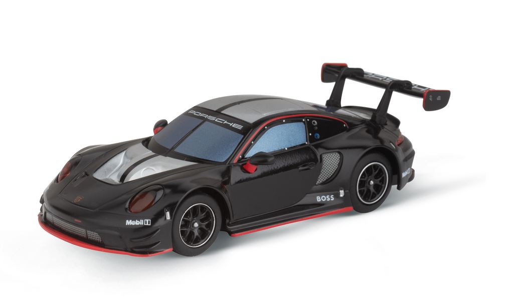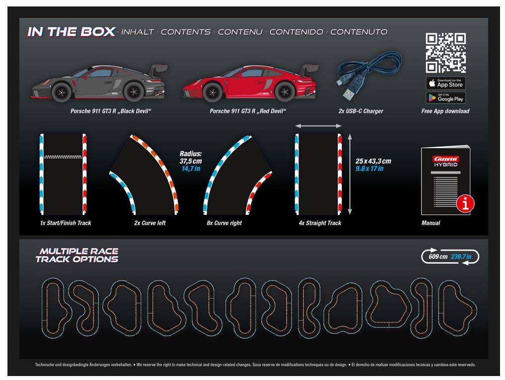 Porsche 911 GT3 R "Black Devil"Porsche 911 GT3 R "Red Devil"1 Start-/Zielgerade, 4 gerade Fahrba hnteile und 8 rechte und 2 linke Kurvenelemente, 2 USB-C Ladekabel für die in den Fahrzeugen verbaut en Akkus.