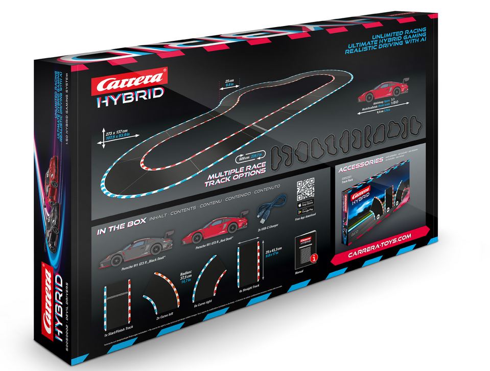 "Devil Drivers"Carrera HybridMaßstab 1:50Ab 12 JahrenCarrera Hybrid – die perfekte K ombination aus Gaming und Rennspaß, denn die Fahrzeuge können vollkommen frei mit Vollgas über die Fahrbahn düsen. Die KI-Unterstützung ermöglicht ein realistisches Fahr erlebnis in verschiedenen Fahrmodi. Erlebe originalgetreue Fahrzeuge mit Front- und Rücklicht, gesteuert per kostenloser App. Mit automatischer Streckenerkennung, individuellen Einstellungen und authentischem Motorengeräusch bietet Carrera Hybrid ein einzigartiges Rennerlebnis. Entdecke zu dem neue Fahrzeuge für noch mehr Rennaction!Freies Fahren für bis zu 30 Fahrer gl eichzeitig auf einer Bahn. Rennsessions mit bis zu 16 Playern.Online Remote PlayOriginalget reue Fahrzeuge im Maßstab 1:50 und extra breite Fahrbahn.Steuerung mittels ko stenloser App für Smartphone oder TabletFreies Fahren auf und neben der Fahrbahn un d Überholen an jeder StelleIndividuelle Einstellungen von Geschwindigkeit, Reifengrip, B remswirkung und vielem mehr!