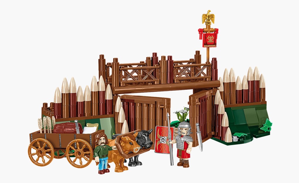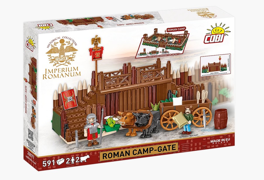 Das Tor mit Kaufmann und Wache ist Teil eines modularen Sets, das mit anderen Elementen der IMPERIUM ROMANUM-Reihe von COBI kombiniert werden kann, um ein realistisches, weitläufiges römisches Militärlager (Castrum) zu erschaffen.