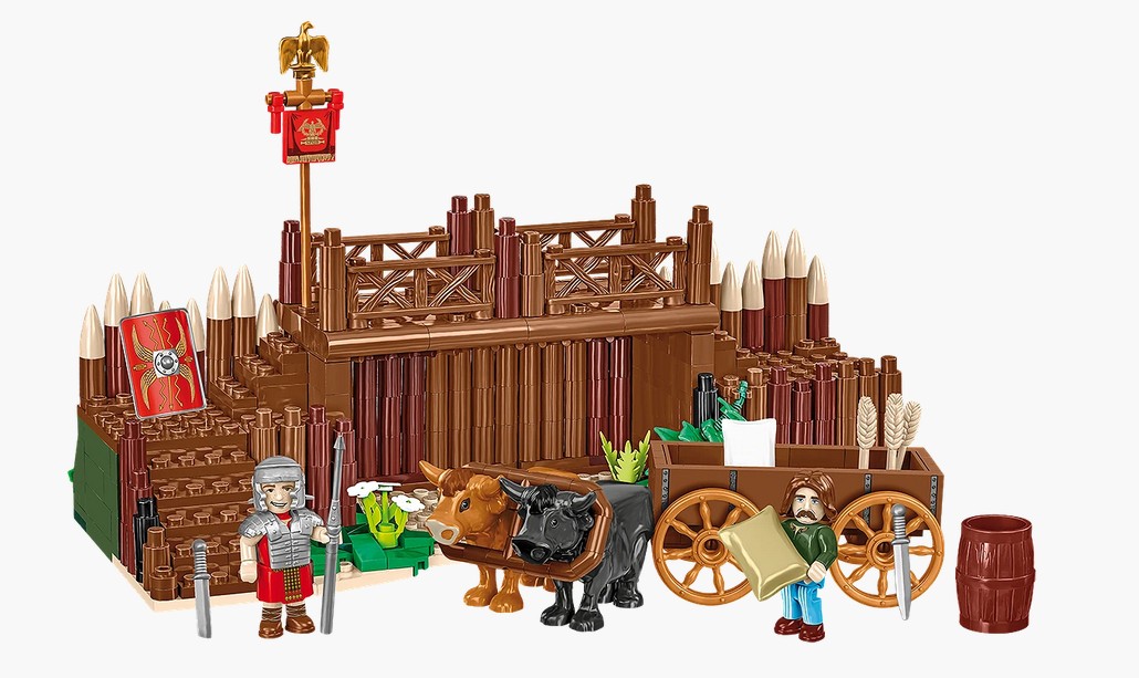 Set mit umfangreichem Zubehör – Ein Wagen mit Gütern, ein realistisches Tor, Ochsen, eine Legionsstandarte und detailreiche Figuren schaffen eine stimmige, stimmungsvolle Szene – perfekt zum Spielen, Sammeln oder Erweitern größerer Bauwerke.