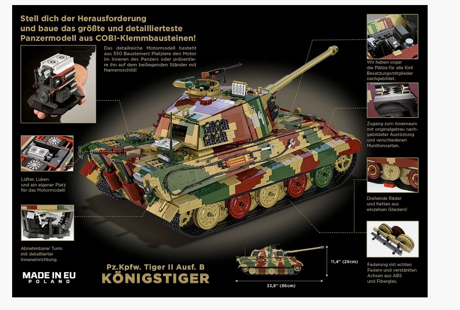 Es ist riesig. Es ist legendär und einzigartig! Dies ist kein gewöhnliches Modell. Es ist ein monumentales Meisterwerk der Ingenieurskunst aus COBI-Bausteinen! So etwas hat es noch nie gegeben! Dies ist eine gigantische Hommage an einen der bekanntesten und furchterregendsten Panzer des Zweiten Weltkriegs. Dieses Modell wird aus über 11.000 sorgfältig gestalteten Steinen gebaut und ist ein wahres Sammlerstück, ein Objekt der Begierde für jeden Liebhaber von Bausteinmodellbau und -geschichte.