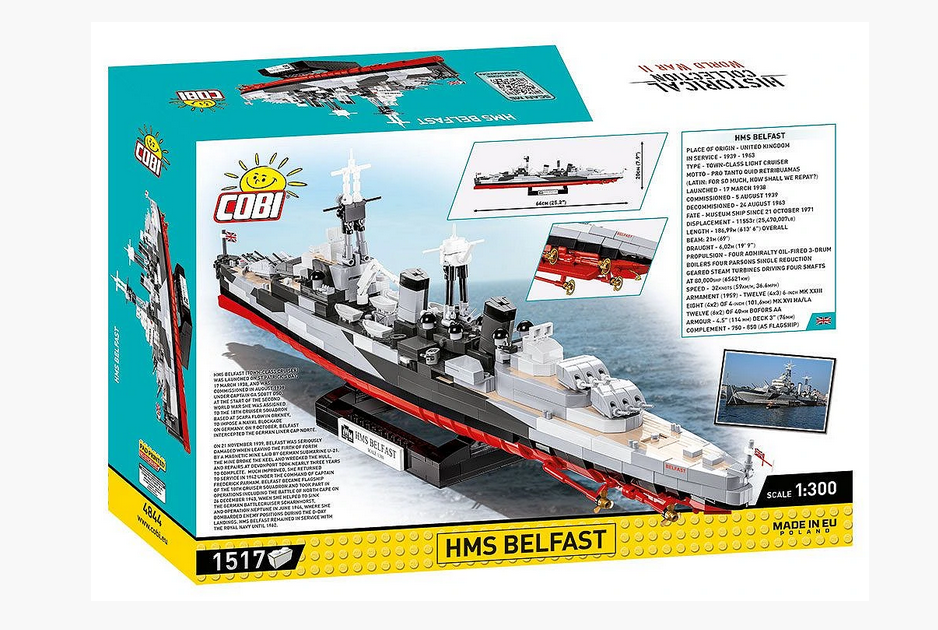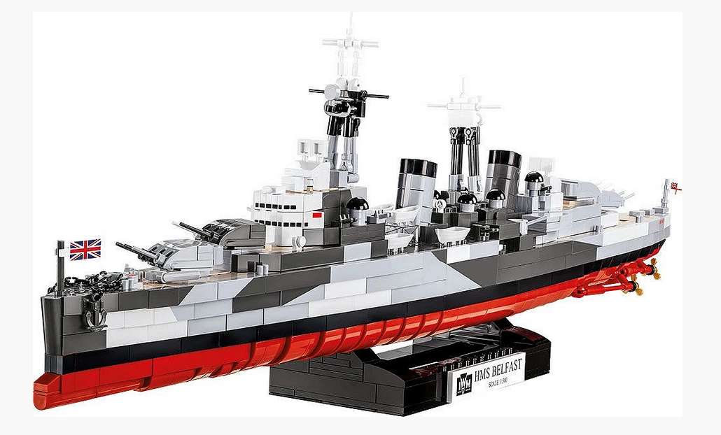 Die Firma COBI hat im Rahmen der prestigeträchtigen Zusammenarbeit des IMW (Imperial War Museums) ein Modell des historischen britischen Kreuzers HMS Belfast vorbereitet. Das Schiff wurde im Maßstab 1:300 entworfen und gibt die Details seines historischen Vorbilds originalgetreu wieder. Der leichte Kreuzer ist 64 cm lang und 19,5 cm hoch. Es hat viele bewegliche Elemente wie Deckgeschütze, rotierende Artillerietürme, Ruder und Propeller. Das Modell wurde mit hochwertigen Drucken überzogen, die Ausrüstung und Tarnung imitieren. Drucke reiben auch bei intensiver Nutzung nicht ab. Das Set enthält einen schwarzen Ständer und eine weiße Platte mit dem Namen und dem Maßstab des Modells, die darauf aufgedruckt sind. Die Plakette zeigt auch das IMW-Logo (Imperial War Museums). Das Produkt erfüllt perfekt die Funktion eines exklusiven Geschenks für alle Liebhaber der Geschichte, des Militärs und der Meereswissenschaften. Es wird auf einem Schreibtisch, Bücherregal oder auf einem Regal mit Souvenirs großartig aussehen. Bauen Sie Geschichte, Stein für Stein!