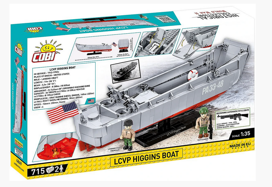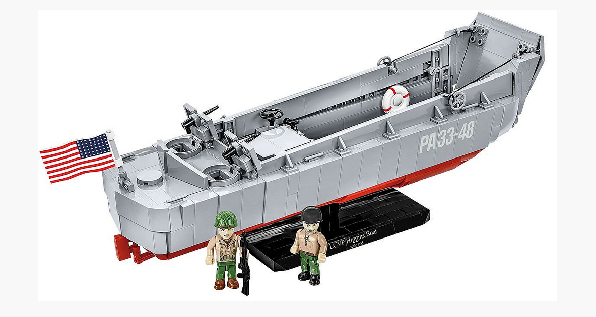Das Higgins-Bootsmodell aus COBI-Bausteinen spiegelt sein historisches Vorbild originalgetreu wider und behält dabei den beliebten Maßstab 1:35 bei. Das Landungsboot aus Klemmbausteinen hat eine völlig neue Struktur, die von Grund auf neu entwickelt wurde. Das Modell ist 36 cm lang. Es verfügt über eine zu öffnende Rampe und einen detaillierten Vollrumpf. Das Set umfasst bewegliche Elemente wie zwei Maschinengewehre mit Abdeckungen und einen Mechanismus zum Absenken und Anheben der Frontrampe basierend auf einem Seilzugsystem. Wir haben Details wie das Ruder, die Turbinen und die zu öffnende Luke mit dem Umriss des Motors darunter nicht vergessen. Das Set verwendet permanente Drucke! Um dieses schöne Modell zu präsentieren, haben wir einen speziellen Ausstellungsständer aus Klemmbausteinen mit einem Schild mit dem Namen des Bootes entworfen. Im Set sind außerdem zwei Figuren enthalten, die einen amerikanischen Infanteriesoldaten und einen Matrosen der Binnenschiffsbesatzung darstellen. Auf dem Kahn weht eine große, beidseitig bedruckte US-Flagge.