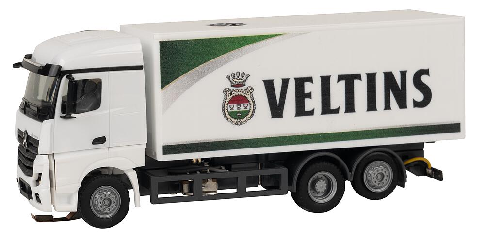 Jetzt wird auch Bier ausgefahren! Im modernen Mercedes Actros mit Liftachse und Kofferaufbau im Design der Brauerei »Veltins«. Technische Fahrzeugdetails: - Mikroschalter für an/aus - Realistisches Anfahr- und Bremsverhalten - Steuerbare Licht- und Soundfunktionen - Lastgeregelter Antriebsmotor für Bergauf-/ Bergabfahrten - Ortung via Ultraschall-Emitter - Leistungsstarkes Funk-Sende- und Funk-Empfangs-Modul - Hochwertige Elektronik-Komponenten - Leistungsstarker NiMh-Akku (schnellladbar) - Magnetfeld-Sensor - Vollgummibereifung für sicheren Grip - Lenkfähige Pendelachse mit Schleifer und Magnet - 3-Pin Ladebuchse - Mehrere Stunden Laufzeit pro Ladevorgang - Analog-Fahrbetrieb möglich - Ausführliche Anleitung - Mögliche Ladegeräte (separat erhältlich): »Prozessorgesteuerte Ladestation«, Art. 161349 Beachten Sie bitte: - Für den Straßenbau nur FALLER Originalmaterialien verwenden, um den sicheren Betrieb zu gewährleisten. - Ersatzteile sind über den Fachhandel oder direkt bei FALLER erhältlich.