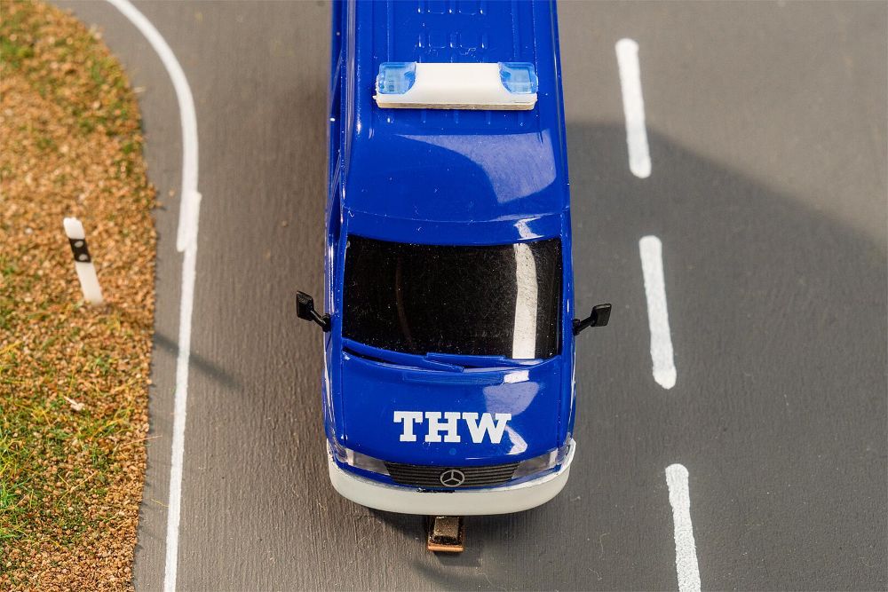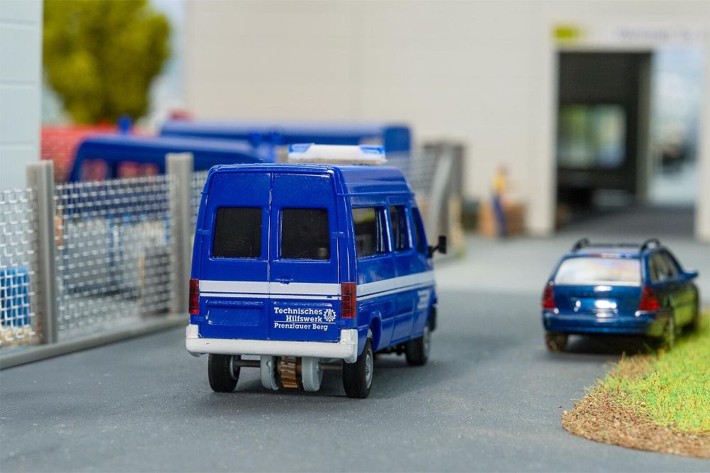 Ein tiefblauer THW-Sprinter fährt über die Miniaturstraße, bereit für seinen nächsten Einsatz. Dieses Modell bringt Schwung und Dynamik auf die Anlage und ergänzt diese perfekt!