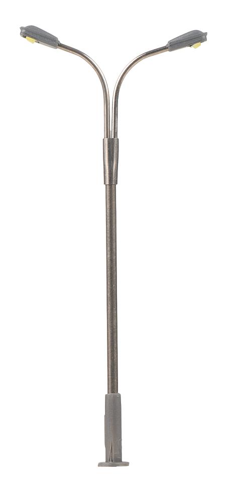 Moderne Peitschenleuchte mit zwei Auslegern. Besonders geeignet zur Ausgestaltung von Stadt-, Straßen- und Industrieszenerien. Der Mast ist aus Metall gefertigt und die Leuchtenhöhe variabel einstellbar. Die filigrane zweiflammige Leuchte ist mit langlebiger LED-Technik ausgestattet. Höhe: 65 mm.