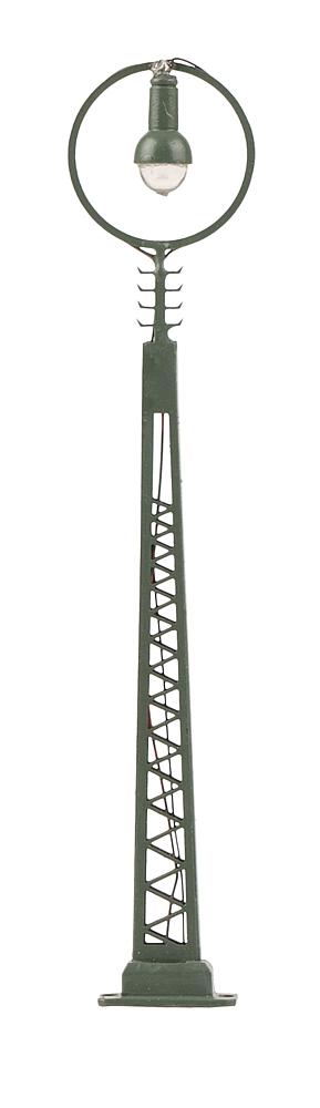 Klassische Ringleuchte mit Gittermast aus Metall. Besonders geeignet zur Beleuchtung von bahnnahen Szenerien, wie Bahnhöfen, Betriebswerken oder Gleisfeldern. Die einflammige Leuchte ist mit langlebiger LED-Technik ausgestattet. Höhe: 84 mm.