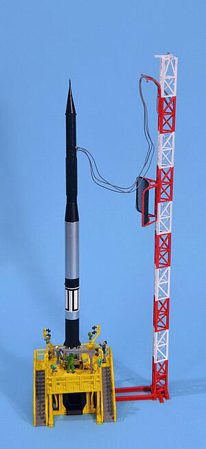 Plastikmodellbausatz einer US-amerikanischen Rakete aus den 1950er Jahren mit Abschussrampe.