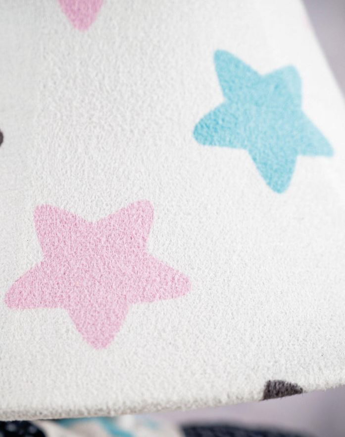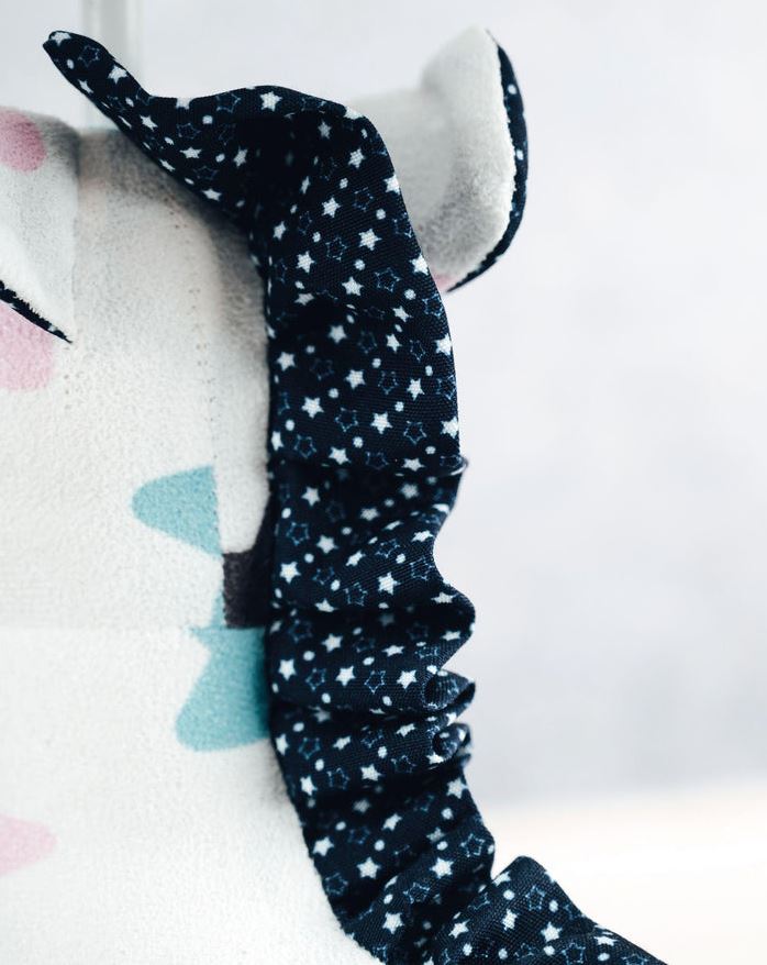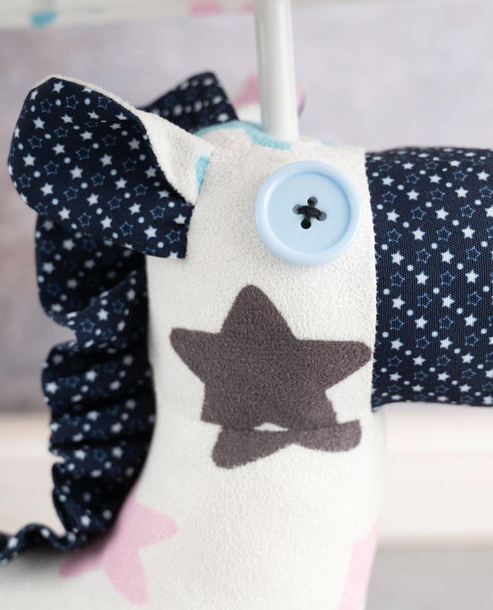 Finns Körper und sein Lampenschirm sind mit einem außergewöhnlichen Sternmuster bedeckt. Seine Ohren, seine Schnauze und seine Mähne sind dunkelblau-weiß gepunktet und seine bezaubernden Augen bestehen aus aufgenähten, hellblauen Knöpfen.