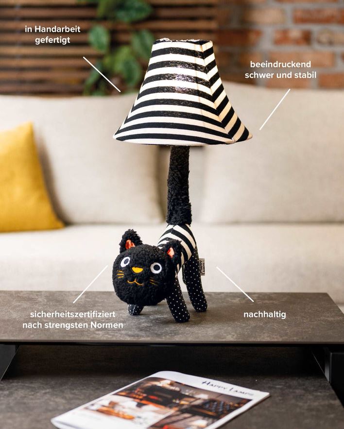 Mit ihren gepunkteten kleinen Beinchen, dem gestreiften Körper und Lampenschirm ist Luna ein richtiger Hingucker im Raum. Ihr Wollgesicht mit den gestickten Augen und dem Mund lässt sie unglaublich freundlich, niedlich und sympathisch wirken. Typisch für Katzen, die ihren Schwanz steil nach oben richten, ist Luna gut gelaunt und immer froh, dich zu sehen. Sie trägt darauf auch stolz ihren Lampenschirm und wartet, bis sie bei dir zuhause zum Einsatz kommen darf.