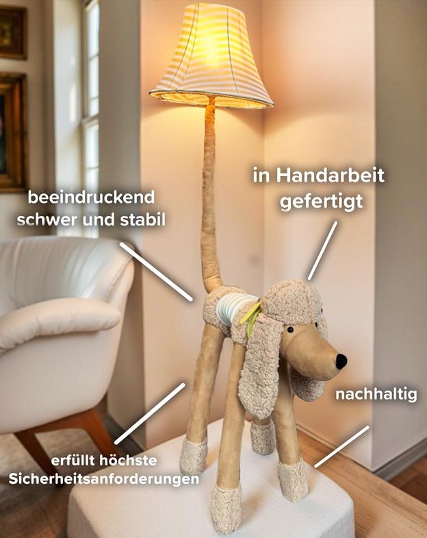 Mit seinen weichen Plüschpfoten, dem gestreiften Bauch und natürlich seinem eleganten Lampenschirm strahlt Bello pure Gemütlichkeit aus. Sein treuer Blick und sein wuscheliger Kopf verleihen ihm eine besonders liebenswerte Ausstrahlung. Typisch für einen Pudel hebt er stolz den Kopf – oder besser gesagt seinen Schwanz – und trägt darauf seinen Lampenschirm mit Stil.