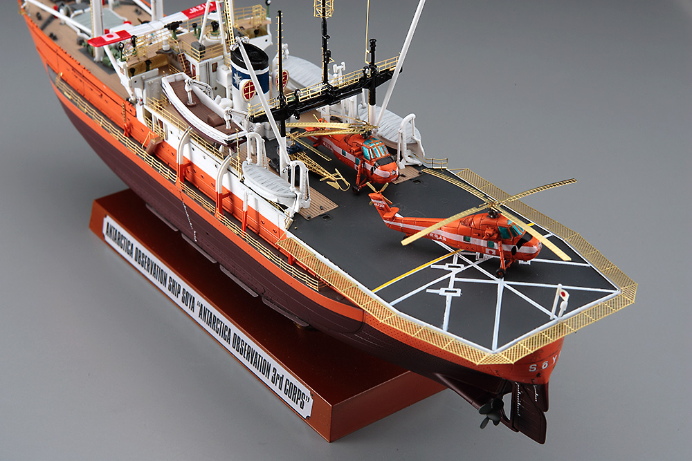 Plastikmodellbausatz eines japanischen Forschungsschiffes mit 324 Teilen und Foto-Ätzteilen. Decals der Japanese Coast Guard Antarctica Observation 3rd Coprs PL107, 1958. Länge gebaut 239 mm / Breite 48,5 mm.