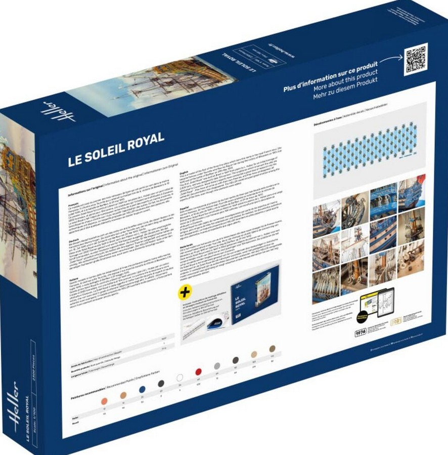 Bei diesem Modell handelt es sich um das erste von drei Schiffen einer Linie, die diesen Namen in der französischen Marine trugen. Sie zeichnete sich unter Tourville aus, der sie beim Sieg von Béveziers am 10. Juli 1690 und in der Schlacht von Barfleur am 29. Mai 1692, führte. Diese erste Soleil Royal wurde 1669 in Brest nach den Plänen von L. Hubac für eine ursprüngliche Tonnage von 2000 Tonnen gebaut und war für 104 Kanonen ausgelegt. Die Skulpturen, die das Schiff schmückten, wurden Coysevox zugeschrieben. Die Experten für Marinegeschichte hatten die „Soleil Royal“ gründlich erforscht: Sie hatten alle ihre eigenen Theorien aufgestellt und waren sich uneinig. Alle authentischen Dokumente waren verschwunden. Das HELLER Modell löste unter den damaligen Fachleuten große Emotionen aus, auch wenn neue Elemente hinzufügt wurden. Hinweis: Die auch separat erhältliche Anleitung ist beim Kauf des Modellbausatzes bereits enthalten und muss nicht zusätzlich gekauft werden.