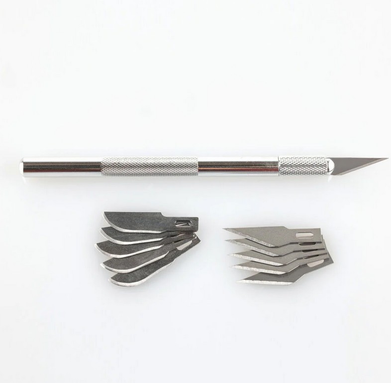 Skalpell mit Aluminiumgriff (125 mm lang) mit Klinge für feine Schnitte und zum Schnitzen, Ritzen, Einstechen und Trimmen. Der schlanke Griff mit seiner geriffelten Oberfläche liegt gut in der Hand und ermöglicht kontrolliertes Arbeiten.