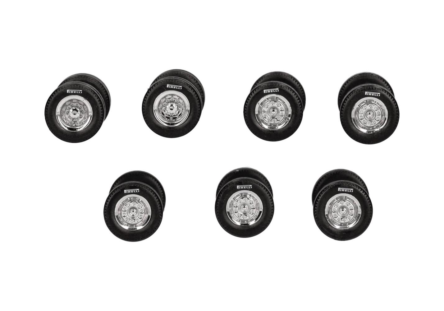 Mit diesem Zubehörset der bedruckten PIRELLI-Reifen auf Chromfelgen kann man wahlweise eine Zugmaschine oder einen Motorwagen (2achs oder 3achs) und einen Anhänger oder Auflieger (2achs oder 3achs) umrüsten. Das Set beinhaltet eine Lenkachse, sowie eine Vor-/Nachlaufachse (mit minimal schmälerer Achse) und zwei Zwillingsachsen die für das Zugfahrzeug herzunehmen sind. Mit den drei verbleibenden Achsen ist dann der Hänger/Auflieger auszustatten.