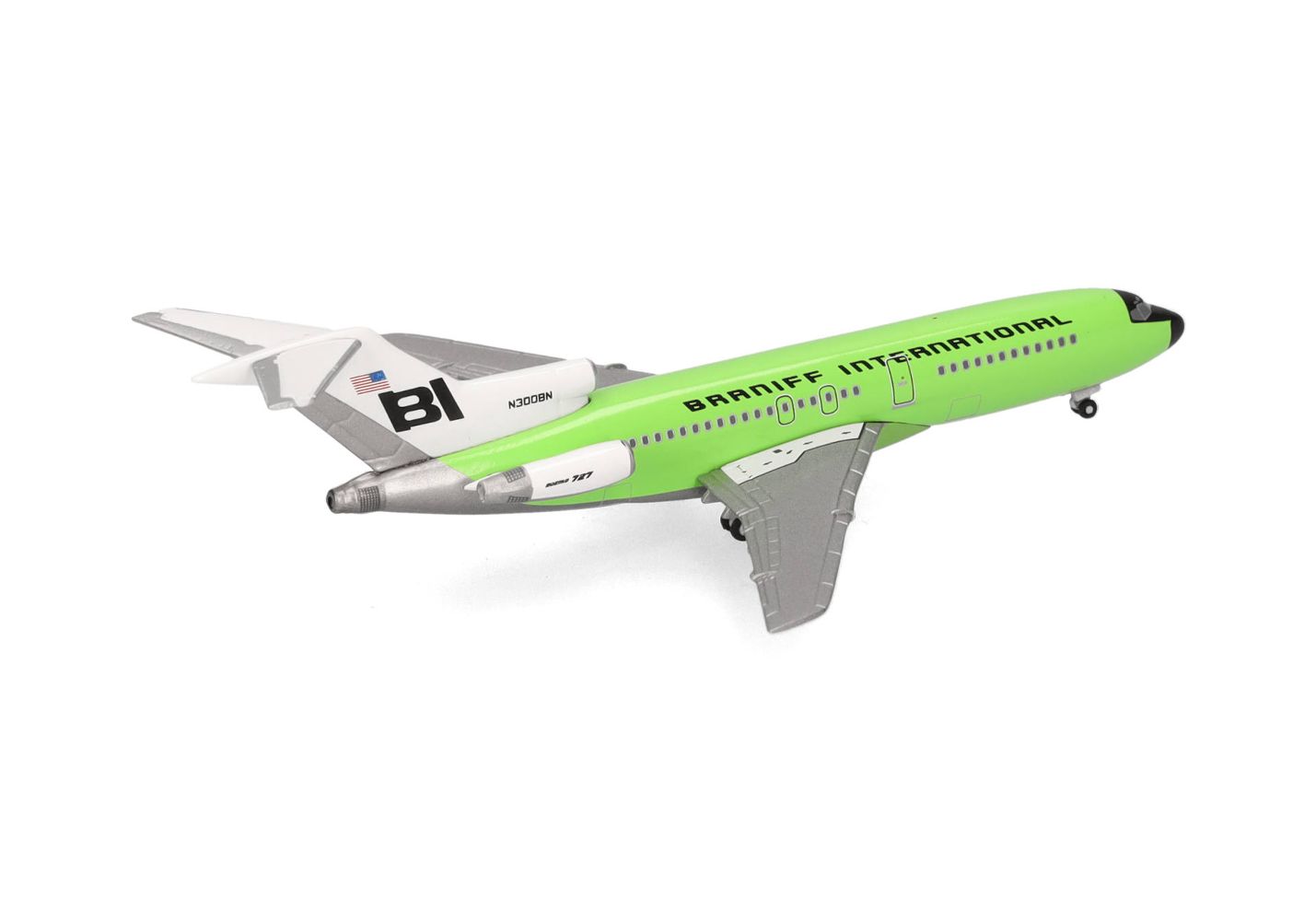 Limettengrün war der letzte „Solid“-Farbton, den die Agentur Harper & Green für Braniff kreierte und ab September 1967 einführte. Nur jeweils eine BAC 1-11, DC-8 und Boeing 707 erhielten die frisch-freundliche Farbe, allerdings gleich sechs Boeing 727. Einer dieser Dreistrahler mit der Kennung N300BN ist auch die Vorlage zu dieser limitierten Neuheit im Maßstab 1:500. 1969 an Braniff geliefert, verblieb sie bis 1982 in der Flotte der texanisches Airline.