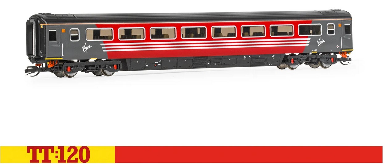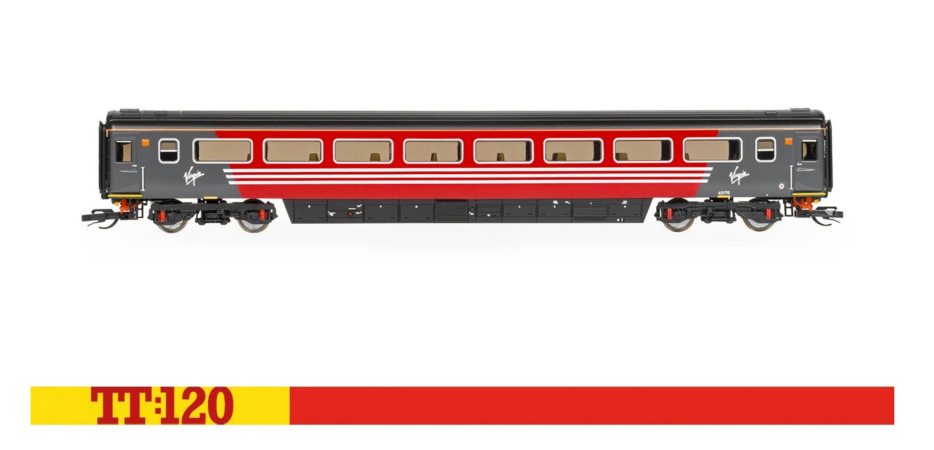In der auffälligen rot-dunkelgrauen Lackierung von Virgin präsentiert sich der TT:120 Virgin HST Mk3 Coach TS 42175, der Teil der legendären Hochgeschwindigkeitszüge war und auf wichtigen Intercity-Strecken in ganz Großbritannien verkehrte.