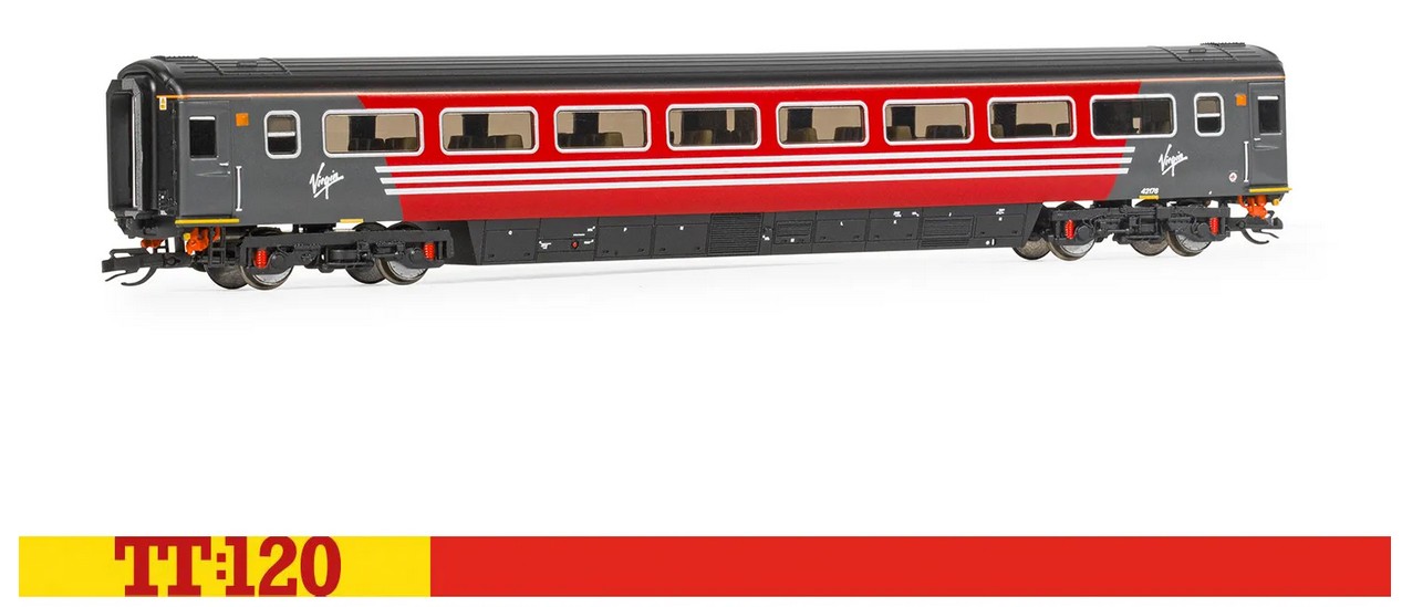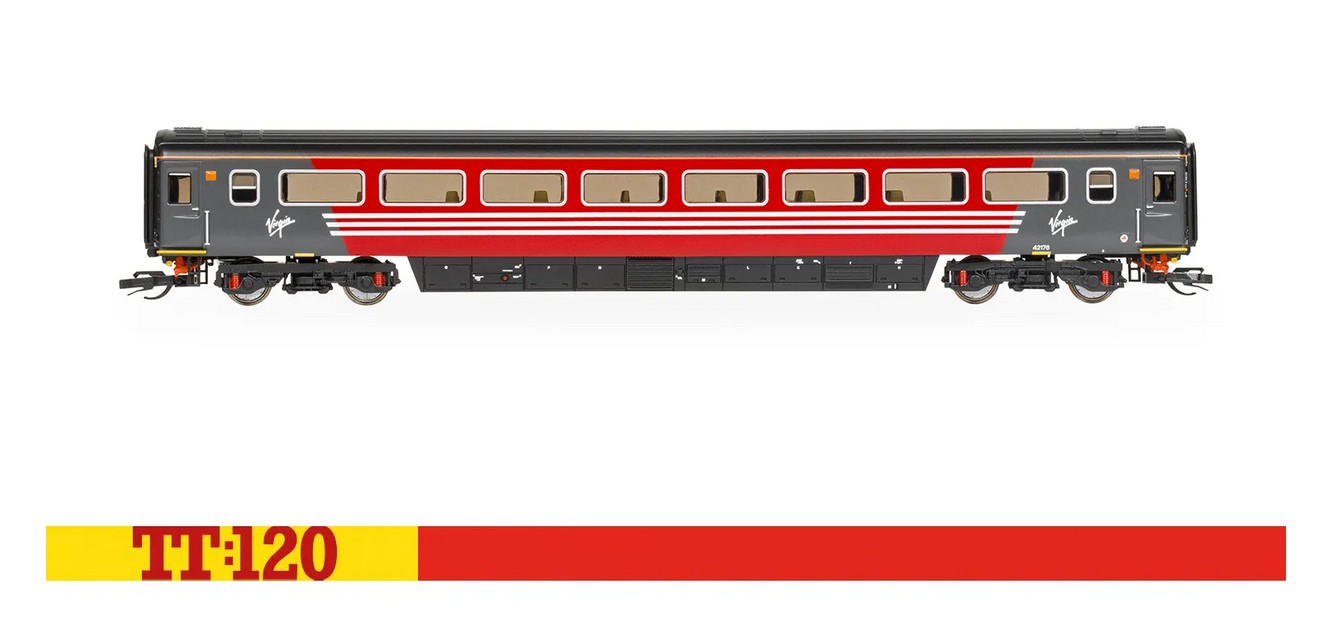 In der auffälligen rot-dunkelgrauen Lackierung von Virgin präsentiert sich der TT:120 Virgin HST Mk3 Coach TS 42176, der Teil der legendären Hochgeschwindigkeitszüge war und auf wichtigen Intercity-Strecken in ganz Großbritannien eingesetzt wurde.