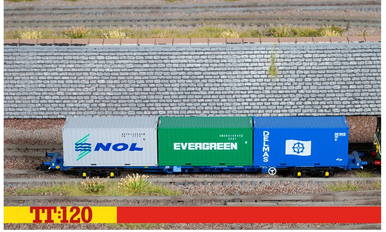Dieses Modell der Touax KFA umfasst drei verschiedene Container im Maßstab OO mit einer Länge von 20 Fuß, darunter solche der Evergreen Marine Corporation, der NOL (Neptune Orient Lines) und der französischen Reederei Delmas.