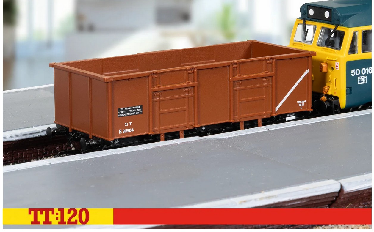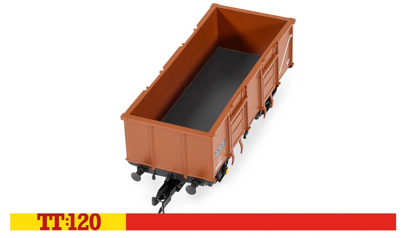 Dieses authentische, detailgetreue Modell TT:120 von Hornby ist eine Nachbildung dieser geräumigen Wagen mit der Lackierung der TOPs-Ära in Bauxit (rot/braun), weißen Markierungen und der Betriebsnummer „B313504“.