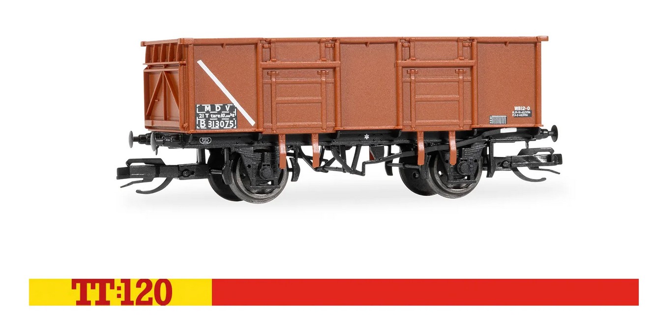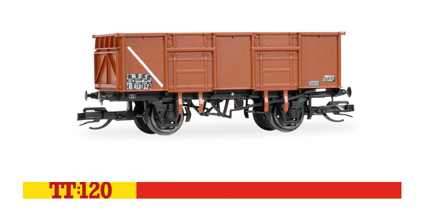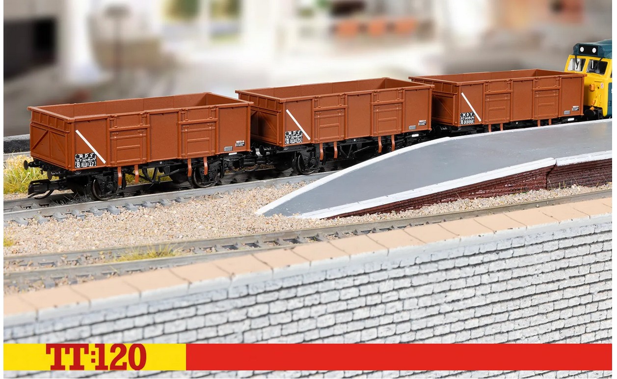 Dieses Dreierpack authentischer, hochdetaillierter Hornby TT:120-Modelle bildet diese geräumigen Wagen mit der TOPs-Ära-Lackierung in Bauxit (rot/braun), weißen Markierungen und den Betriebsnummern „313093“, „313075“ und „313127“ nach.
