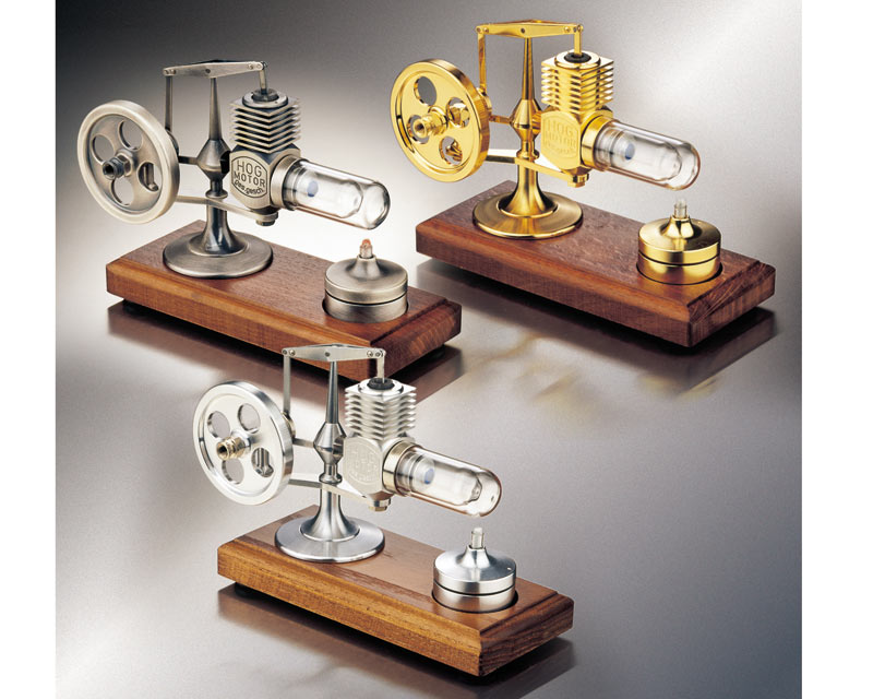 Dieser ganz aus Messing gefertigte, vergoldete Mini-Stirling ist ein Schmuckstück. Mit nur wenig Brennspiritus zeigt dieser Heißluftmotor eine lange Laufzeit und legt eine kräftig hohe Drehzahl vor. Der Kolben und die Lagerung der Verdrängerkolbenstange sind aus einem speziellen, selbstschmierenden Material gefertigt. Das bedeutet absolute Wartungsfreiheit und eine hohe Lebensdauer. Mechanisch ausgelegt ist der Heißluftmotor auf Dauerbetrieb, nur zum Nachfüllen mit Brennstoff sollte er etwas abkühlen können.