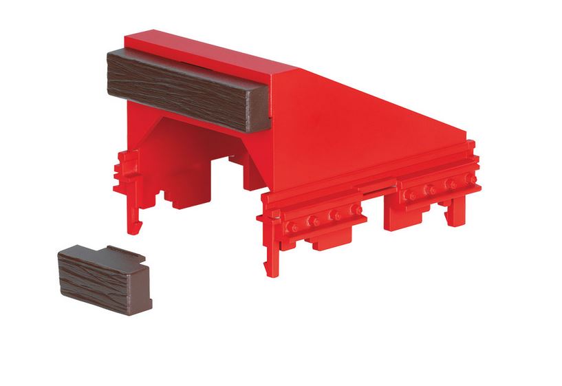 Modell eines modernen Prellbocks der Rhätischen Bahn in der aktuellen roten Lackierung der Epoche VI.