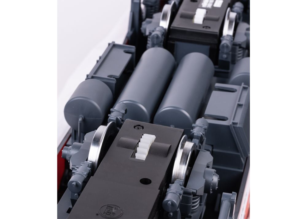 Modell der Elektrolok Nr. 3 "DOM" (Serie HGe 4/4 II) der Matterhorn-Gotthard-Bahn (MGB), wie sie heute noch im Einsatz ist. Originalgetreue Farbgebung und Beschriftung gemäß der Epoche VI. Sonderlackierung mit zwei unterschiedlichen Mitarbeiterwerbungen auf den Seitenwänden der Maschine. Alle 4 Radsätze und zwei Traktionszahnräder von zwei leistungsstarken kugelgelagerten Motoren angetrieben. Ausgerüstet mit einem mfx/DCC-Decoder mit vielen Licht- und Soundfunktionen. Dachstromabnehmer motorisch angetrieben, digital schaltbar. Länge über Puffer 67 cm.