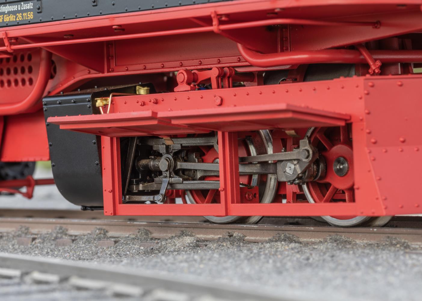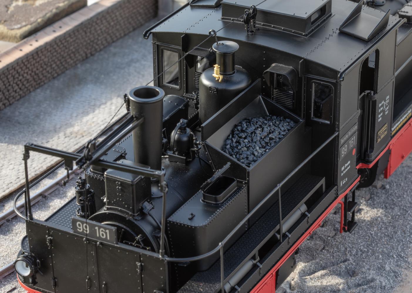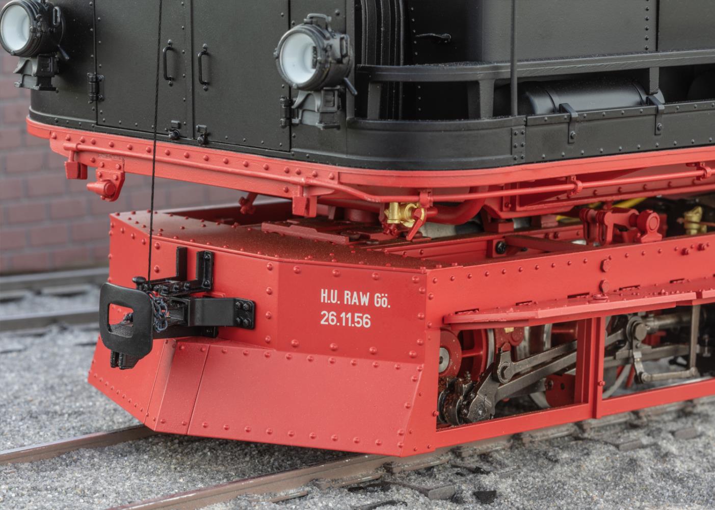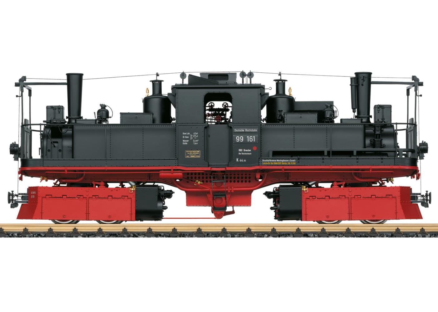 Modell der Dampflok 99 161 der Deutschen Reichsbahn. Feindetailliertes Modell in schwerer Metallbauweise mit vielen angesetzten Details. Antrieb mit zwei Hochleistungsmotoren, alle Treibradsätze über Kuppelstangen angetrieben. Türen zum Führerstand, zum Umlauf, vorne an der Verkleidung und Rauchkammertür zum Öffnen. Klappen an den Drehgestellen zum Öffnen. Originalgetreue Farbgebung und Beschriftung der Epoche III, so wie die Lok in den fünfziger und sechziger Jahren bei der Reichenbacher Rollbockbahn im Einsatz war. Ausgerüstet mit einem mfx/DCC-Decoder mit vielen Licht- und Soundfunktionen wie Spitzenlicht, Führerstandsbeleuchtung, Fahrgeräusch, durch Reedschalter auslösbare Pfeife und Glocke sowie vieles mehr. Fahrgeräusch auch im Analogbetrieb funktionsfähig. Eingebaute Rauchgeneratoren mit radsynchronem Dampfausstoß sowie Zylinderdampf und Dampfausstoß an der Pfeife, wenn diese betätigt wird. Ausgeliefert wird die Lok mit montierten Modellkupplungen, an die die Zugstange der Rollböcke oder der Rollwagen angekuppelt werden kann, entsprechende LGB-Systemlupplungen liegen zum Austausch bei. Länge über Puffer 47 cm.