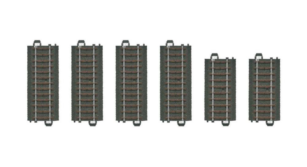 Gleis-Set bestehend aus 4 geraden Gleisen 24094 (je 94,2 mm lang) und 2 geraden Gleisen 24077 (je 77,5 mm lang).