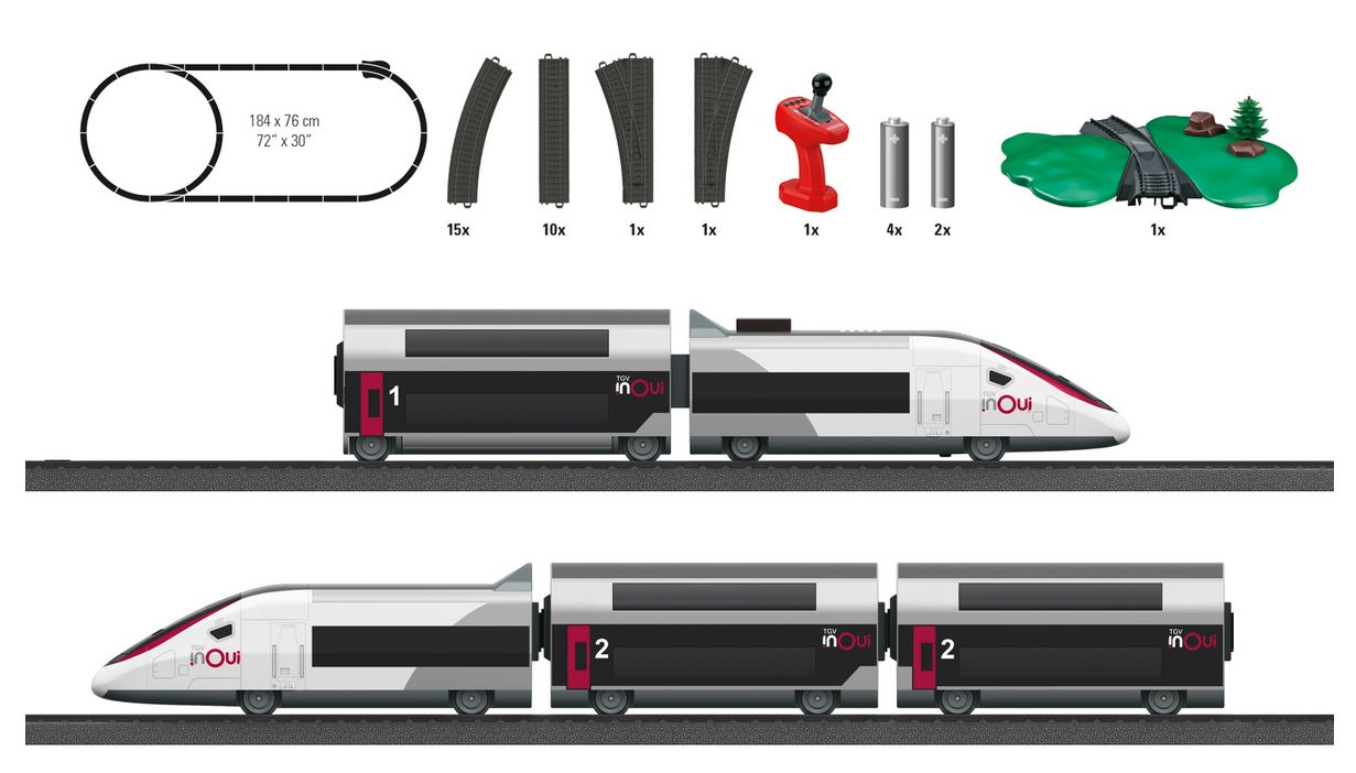 Modell: Zug mit Batterieantrieb und Magnetkupplungen zwischen den einzelnen Wagen. Festgekuppelte Einheit bestehend aus motorisiertem Triebkopf und einem Doppelstockwagen mit integriertem Batteriefach. Der Zug verfügt über 3 Geschwindigkeitsstufen bei Vorwärts- und Rückwärtsfahrt, 3 Soundfunktionen und ein Zweilicht-Spitzensignal. Inklusive Aufklebern für unterschiedliche TGV Zuggestaltungen.