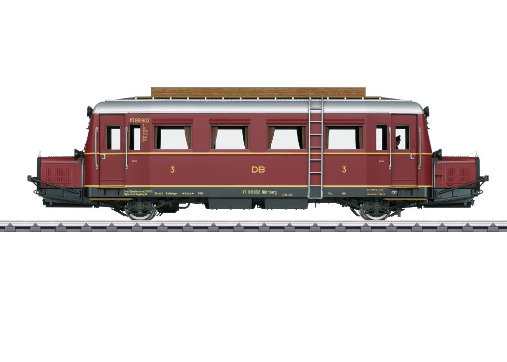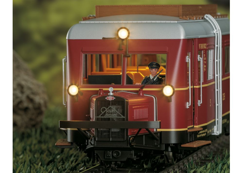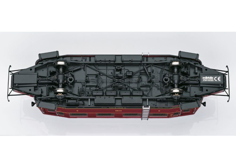 Modell: Komplette Neukonstruktion, Fahrgestell mit Hauptrahmen und Lokaufbau aus Metall. Viele angesetzte Messingteile bzw. angesetzte Metallteile wie Griffstangen, Metallschilder, Scheibenwischer etc. Mit DCC-Digital-Decoder, umfangreichen Geräuschfunktionen wie z.B. geschwindigkeitsabhängiges Fahrgeräusch, Typhon, Schaffnerpfiff, Geschichte des Vorbildfahrzeug uvm. Betrieb mit Wechselstrom, Gleichstrom, Märklin Digital und mfx möglich. Ein Hochleistungsmotor je Fahrzeughälfte mit Antrieb auf beide Achsen. Eingebauter parametrisierbarer Pufferkondensator. Warmweiß/rotes LED-Spitzensignal im Wechsel der Fahrtrichtung, konventionell in Betrieb, digital schaltbar. Instrumentenbeleuchtung schaltbar. Türen motorisch zum Öffnen. Multihaltestellenansage je nach Variante mit vorbildgerechter Strecke. Innenbeleuchtung schaltbar. Hochdetaillierte vorbildgerechte Inneneinrichtung, Führerstand 1 mit eingebauter Lokführerfigur.