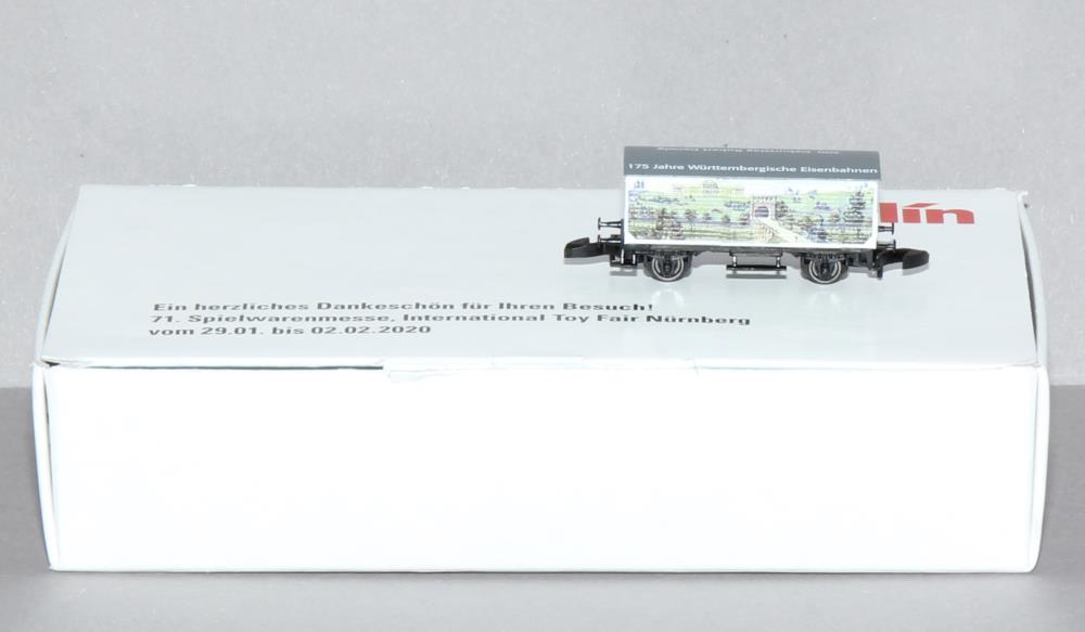 Güterwagen mit Bedruckung 175 Jahre Württembergische Eisenbahn/200. Geburtstag Robert Gerwig verpackt in Pappschachtel