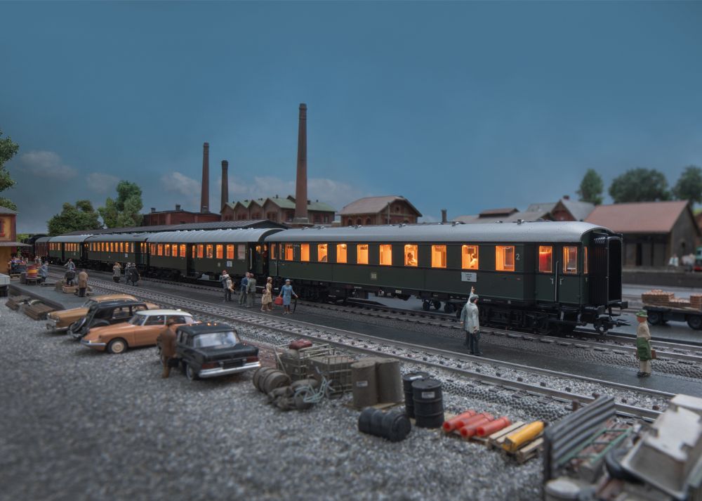 Modell: Jeder Reisezugwagen Wagen mit serienmäßig eingebauter LED Innenbeleuchtung, Pufferspeicher und trennbaren, stromführenden Kupplungen. An einem Wagen ist ein Schleifer montiert. Sitzwagen mit insgesamt 20 Miniatur-Figuren der Fa. Preiser bestückt. Gesamtlänge über Puffer ca. 103 cm.