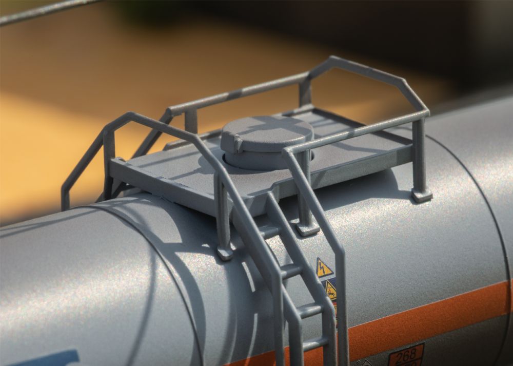 Modell: Detaillierte Fahrgestelle mit durchbrochenem Rahmen. Außenlangträger als U-Profil mit Seilösen. Drehgestelle nach Bauart Minden-Dorstfeld. Separat angesetzte Arbeitsbühnen mit Aufstieg und Bremserbühnen. Darstellung der verstärkten Pufferbohle. Authentische, leichte Alterung auf allen Wagen. Alle Wagen einzeln verpackt in zusätzlicher Umverpackung. Gesamtlänge über Puffer ca. 73 cm.